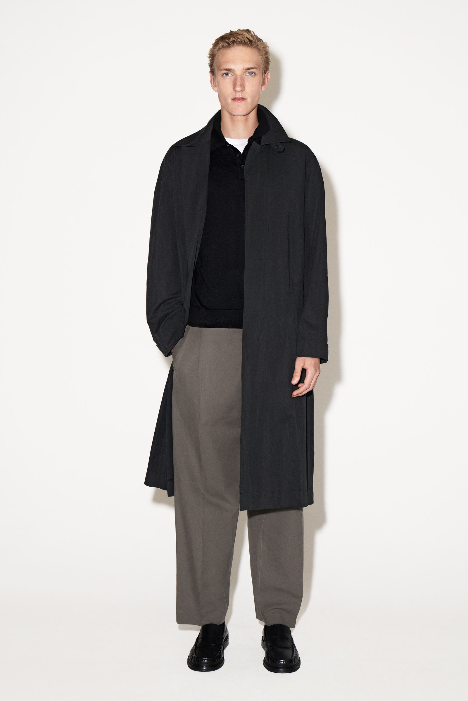 シングルブレストのフロントと角度のあるラペルが、トレンチコートの伝統的なディテールをさりげなく取り入れています。