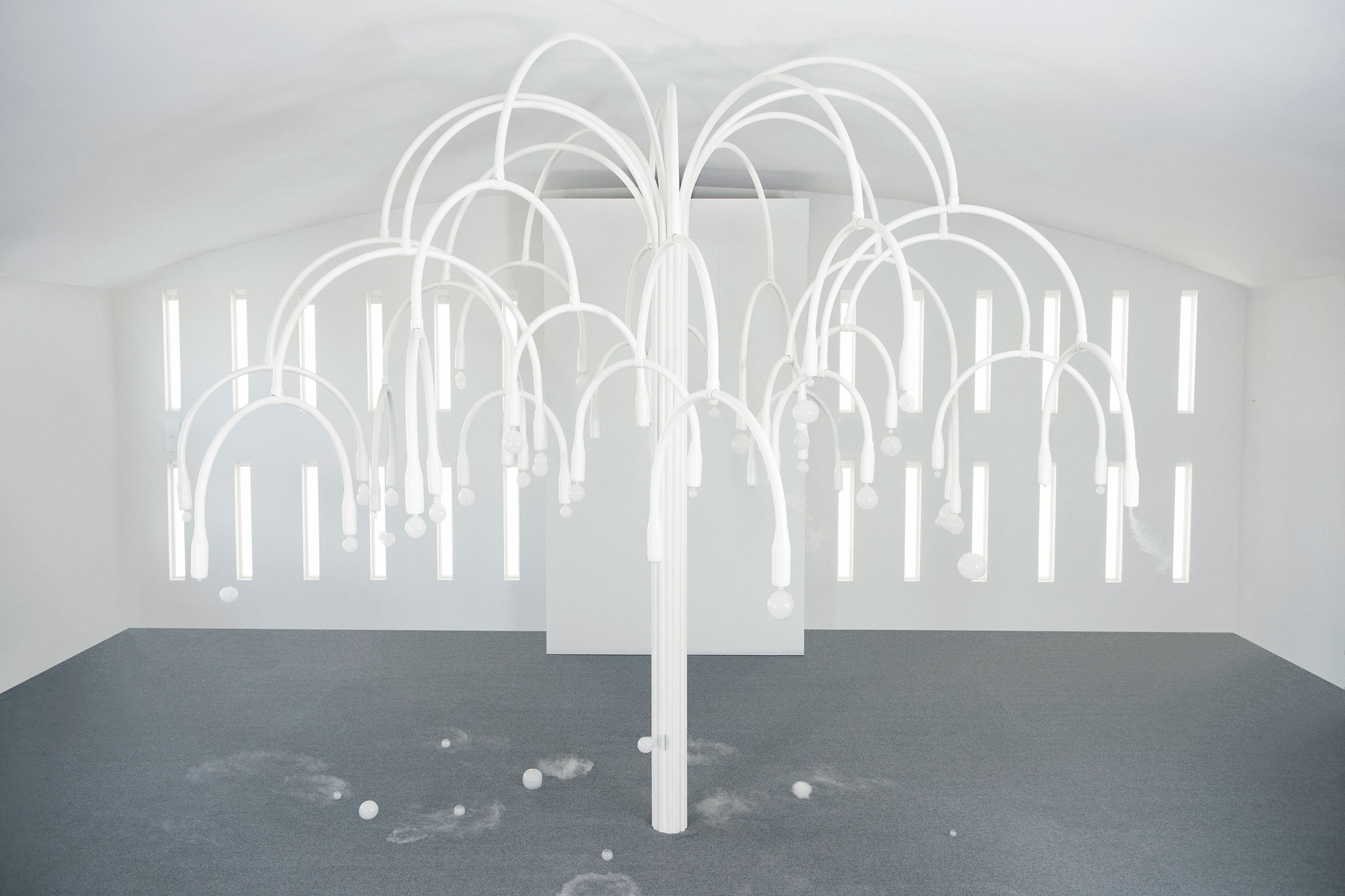 スタジオ・スワインの「New Spring」は、泡の探求を通してこの歴史的伝統を継承します。通常のシャボン玉の体験とはかわって、来場者は手袋の着用によりミストで満たされた泡を手にすることが可能です。儚さのメタファーはデザイン全体を通して続きます。泡を放つ木は、その一時的な開花で有名な日本の桜にインスパイアされています。白い空間にぶら下がる惑星のような球体は、まるで別世界にいるかのような体験を生み出します。シャボン玉が壊れると、小さな銀河のような霧が放出されるのです。