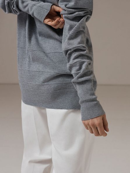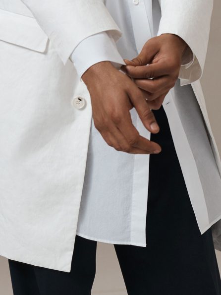 袖のロール。襟が首にフィットした状態。生地が肌に当たる感触。ぼんやりとにカフスに触れる指。これらの小さなムーブメントはどれも重要です。私たちは絶えず、曲げたり、伸ばしたり、ひねったり、身に着ける衣服がどのように身体にフィットするかを変化させています。