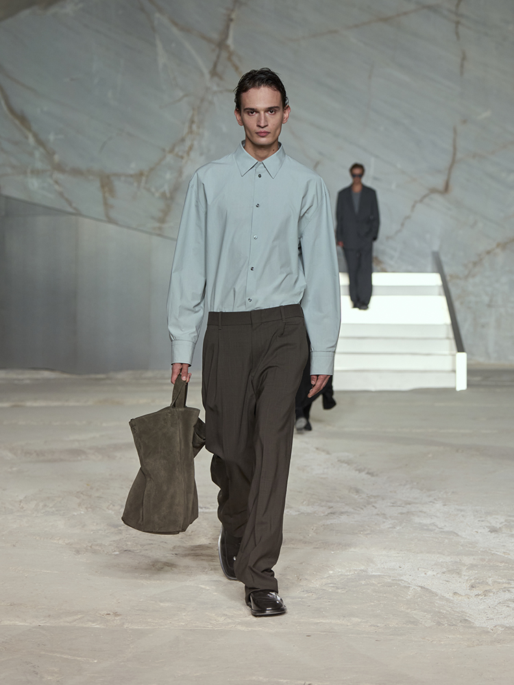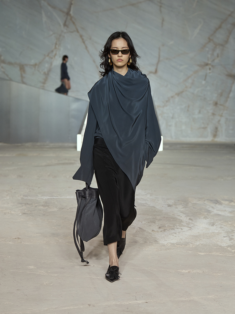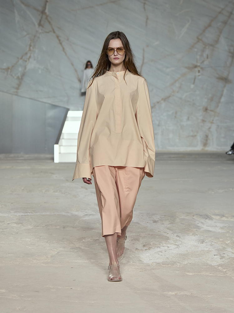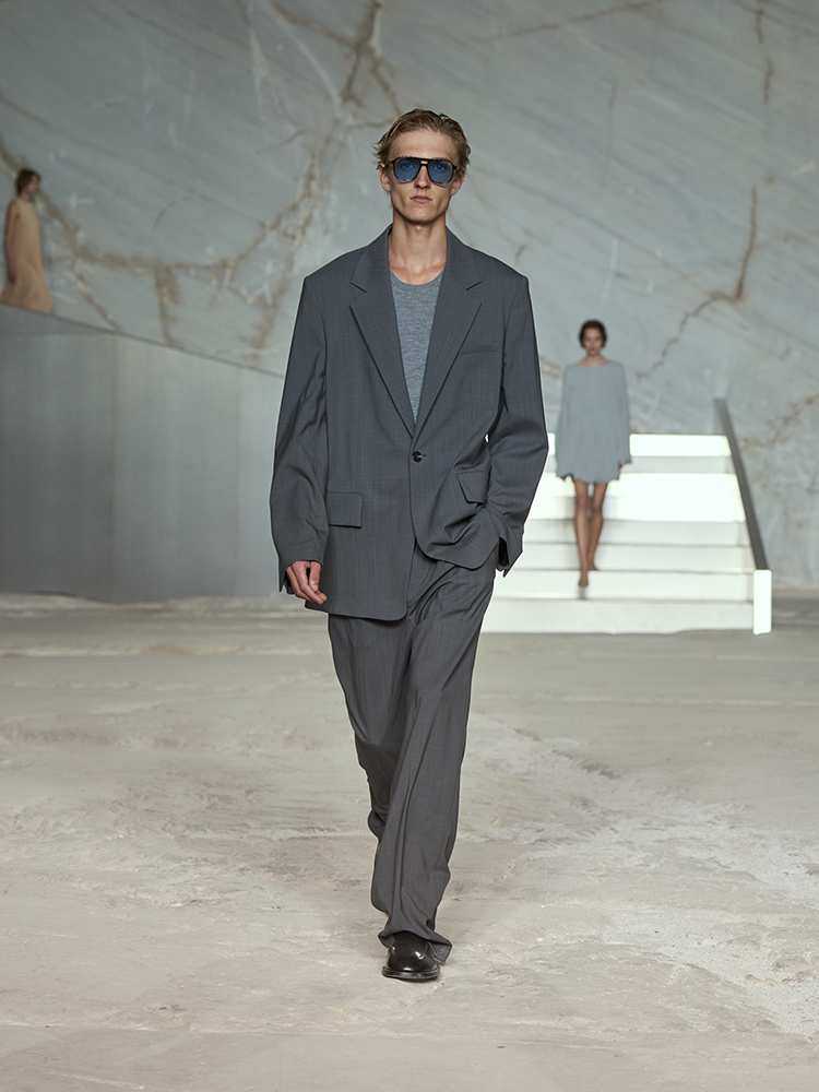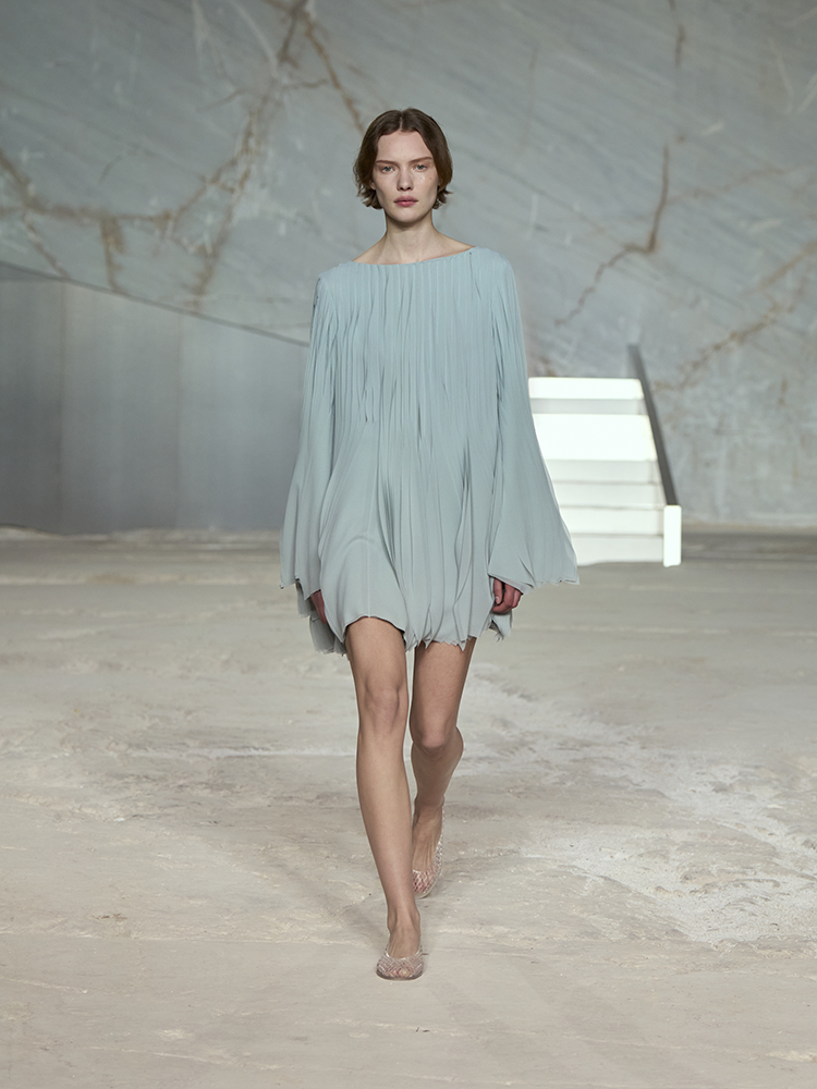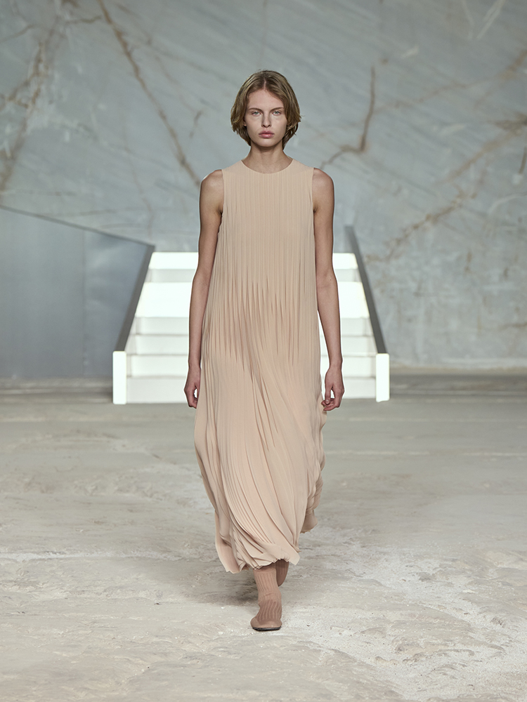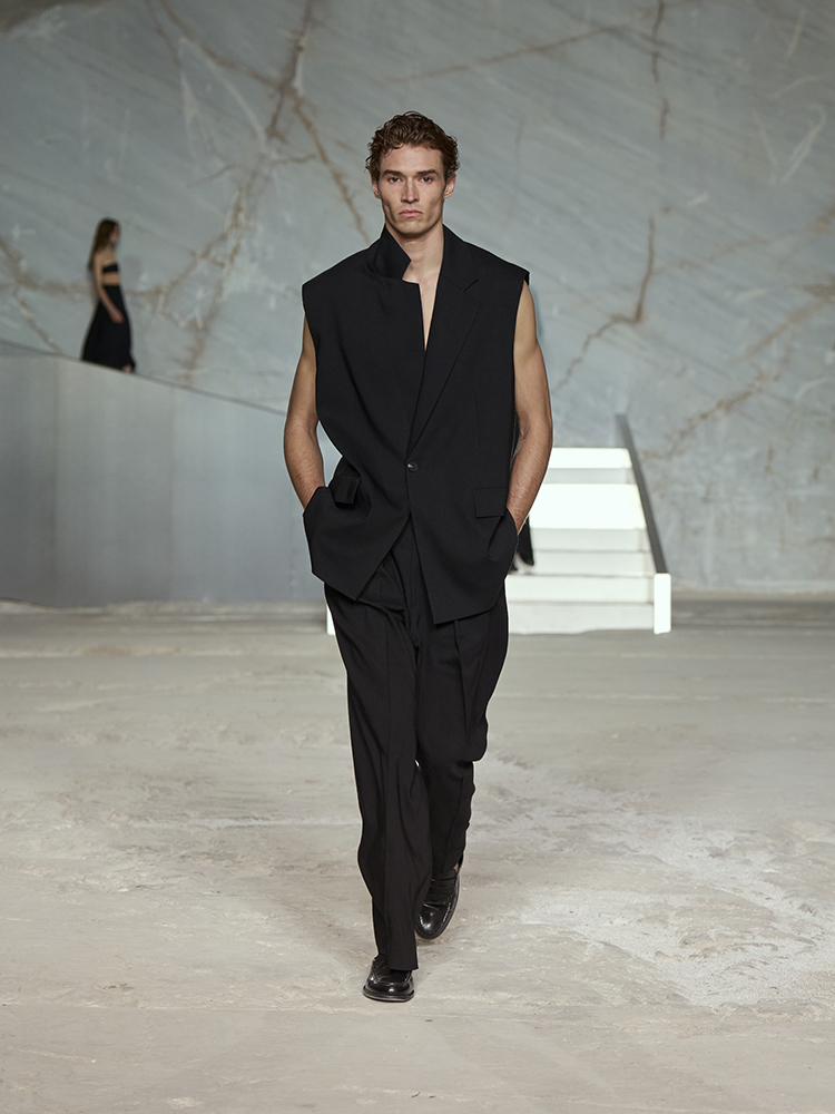 そびえ立つ白い大理石の壁が、新しいコレクションのクリーンなミニマリズムと彫刻のようなラインとの力強いコントラストを生み出し、
