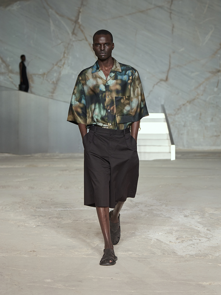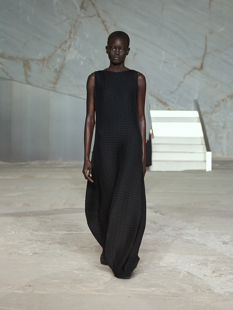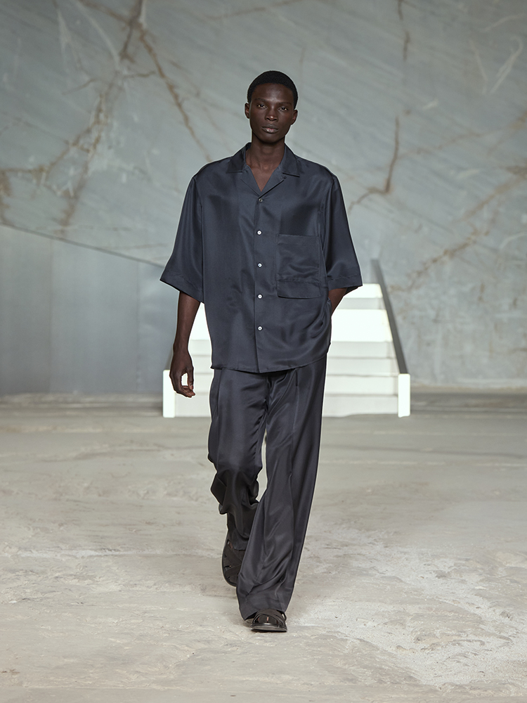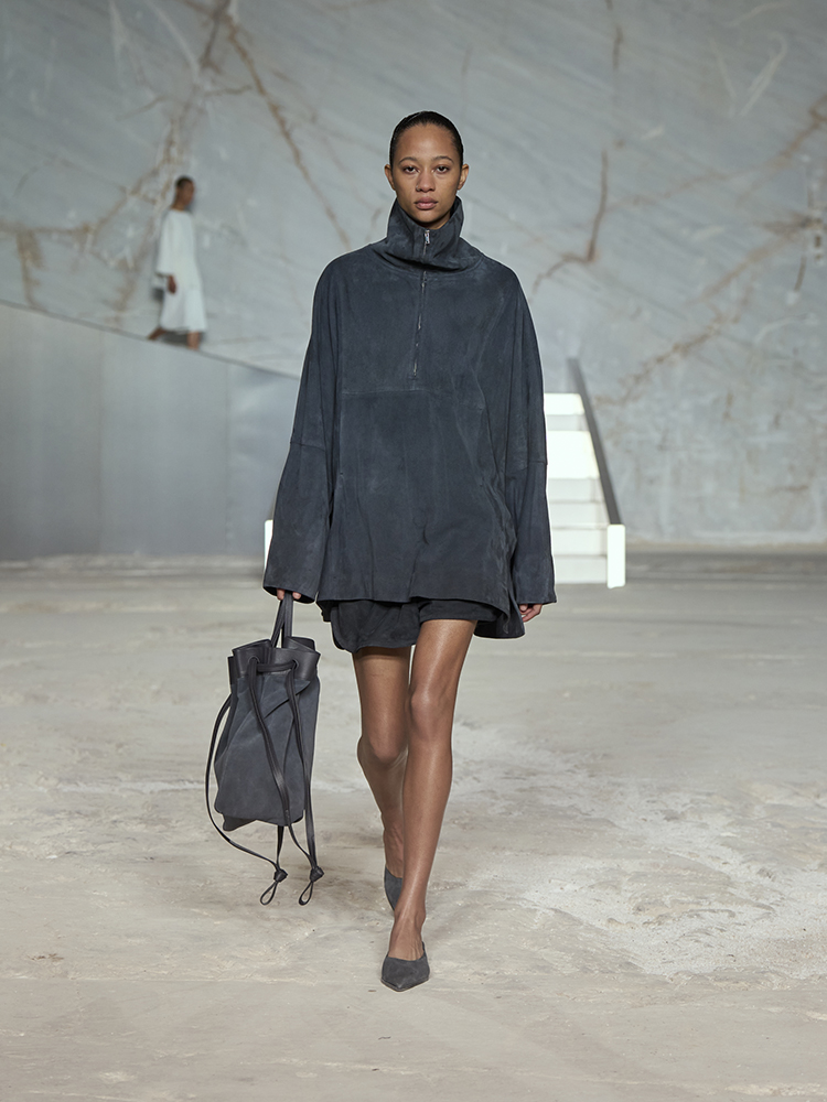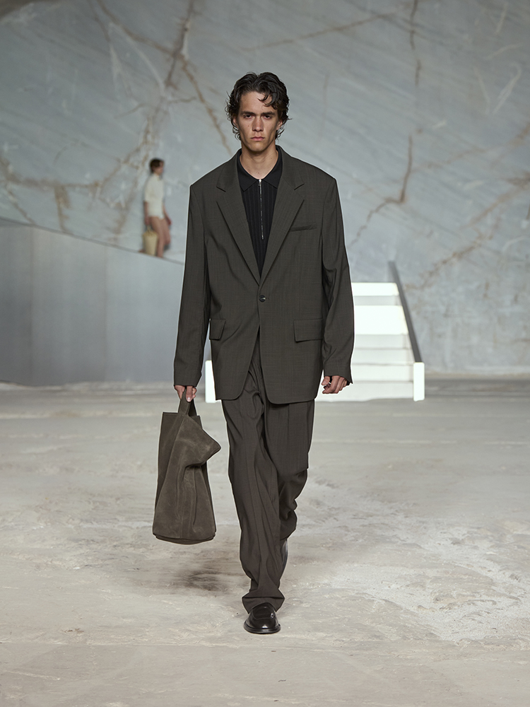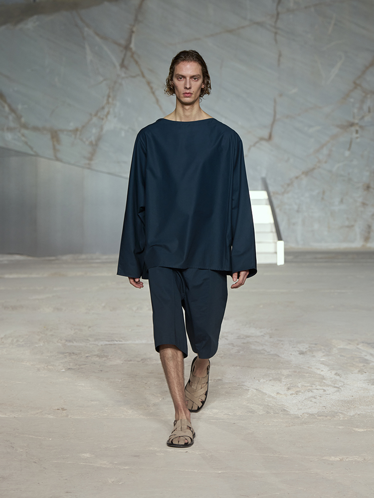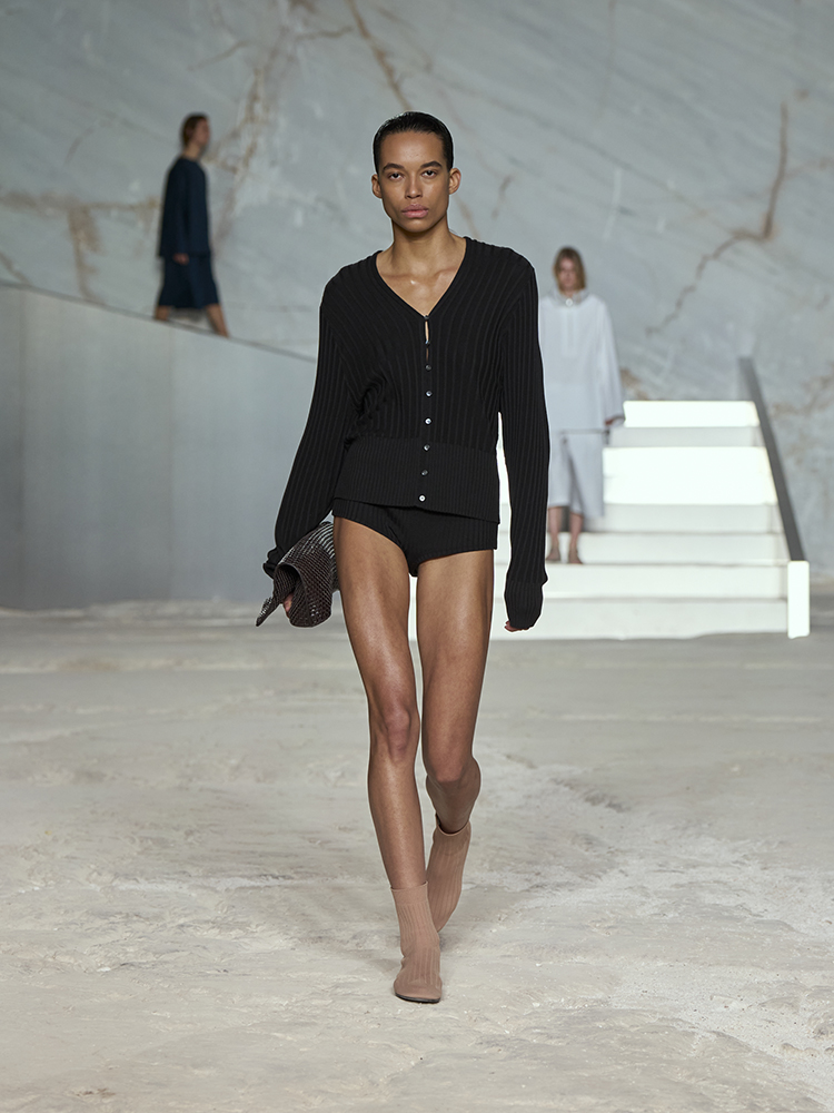 そびえ立つ白い大理石の壁が、新しいコレクションのクリーンなミニマリズムと彫刻のようなラインとの力強いコントラストを生み出し、