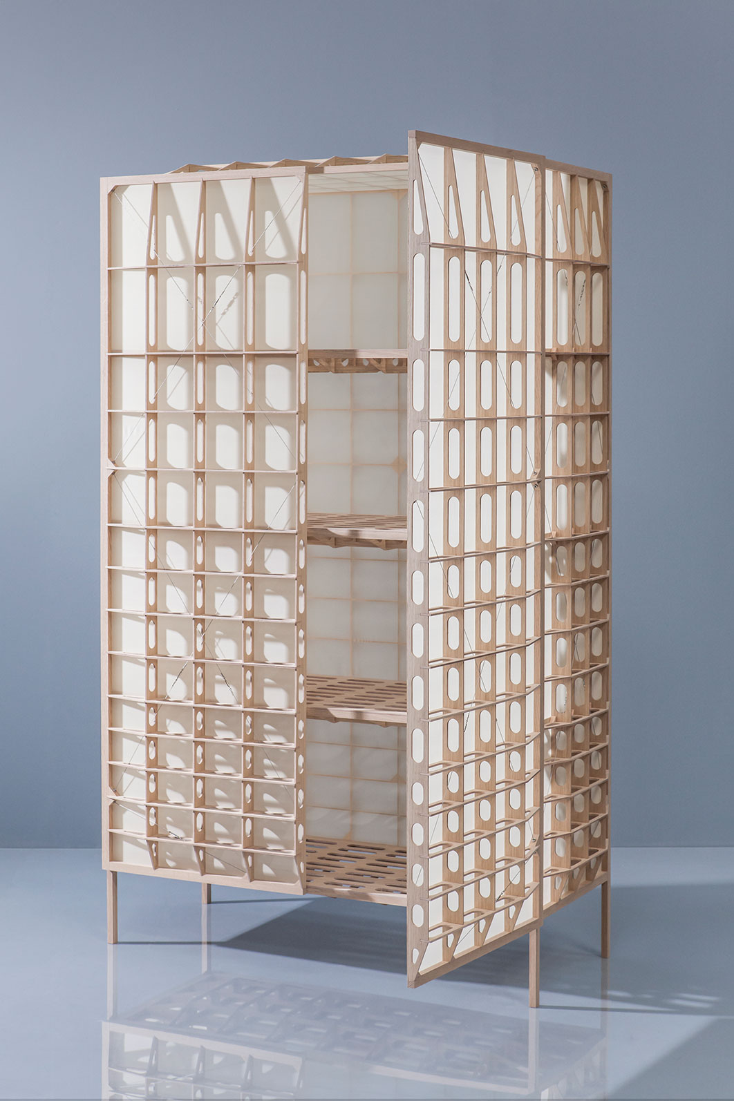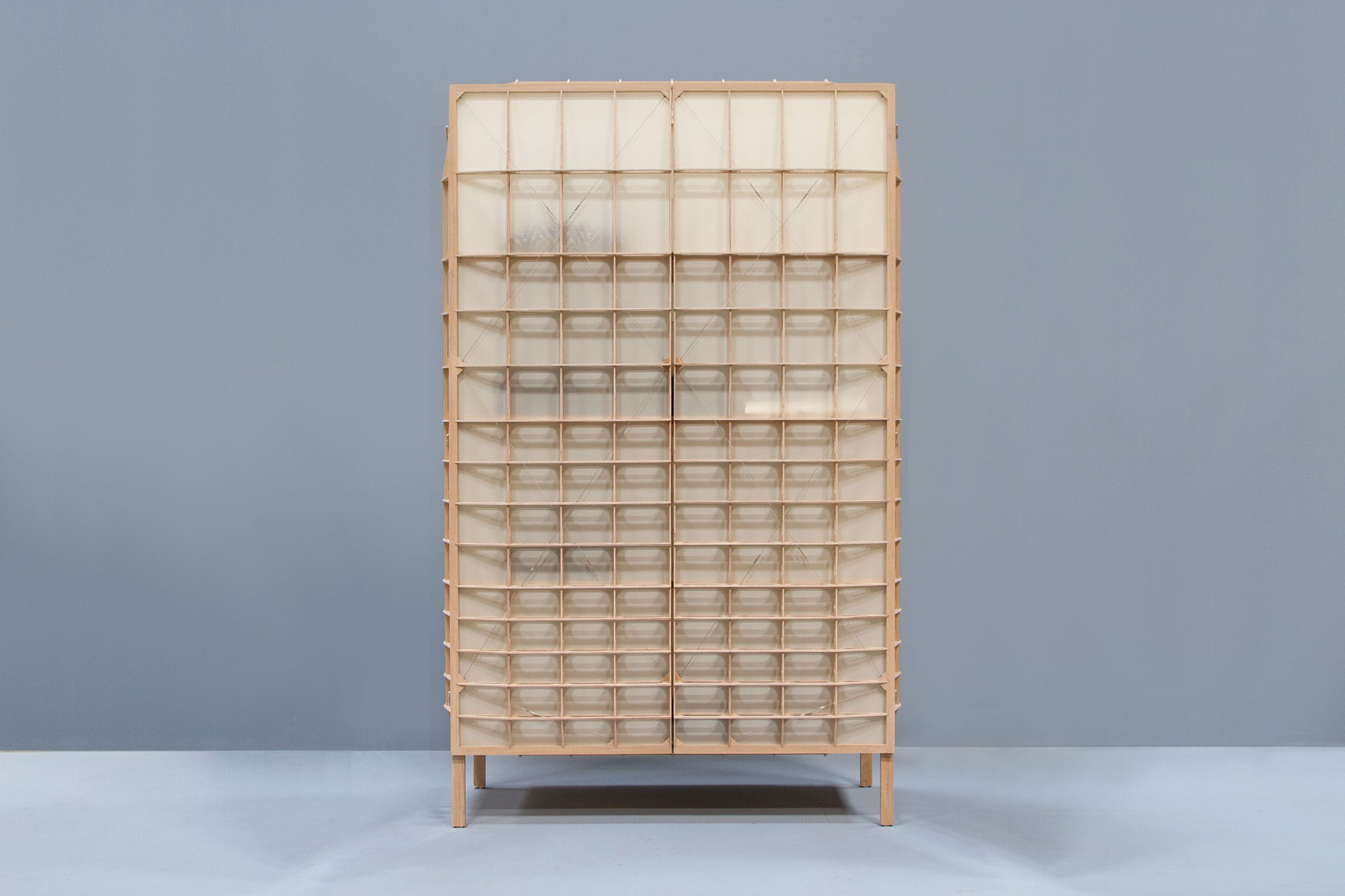 スタジオ マイケル マイヤー(Studio Mieke Meijer)によって設計されたエアフレーム01は、初期の航空機の木製羽根にインスパイアされた軽量キャビネットです。総重量わずか18.5kgのオークフレームのこの作品は、材料会社バールズ&ブルームホフのユニークなテキスタイルのひとつを使用して制作されました。