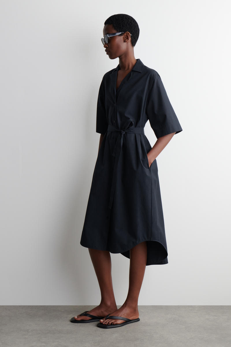 COSレディースウェアチームが、2025年春夏のシャツワンピースを再構築。ピュアなコットンポプリンから作られたこのワンピースは、キャンプカラー、ワイドなショートスリーブ、ティアードのラウンドした裾が特徴です。同系色のベルトをウエストに巻いて。