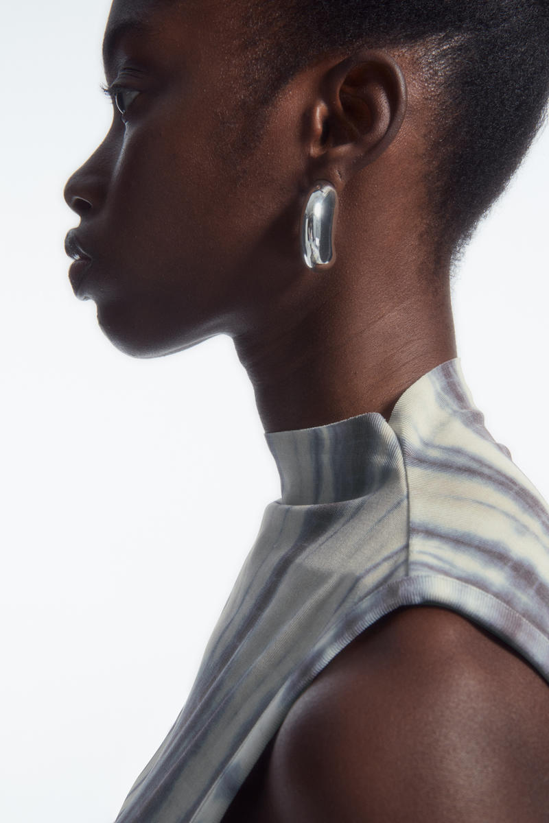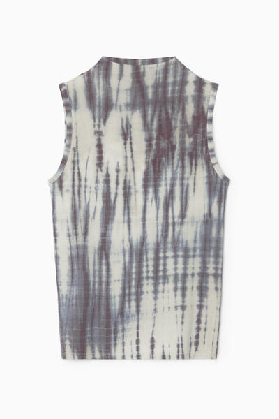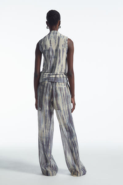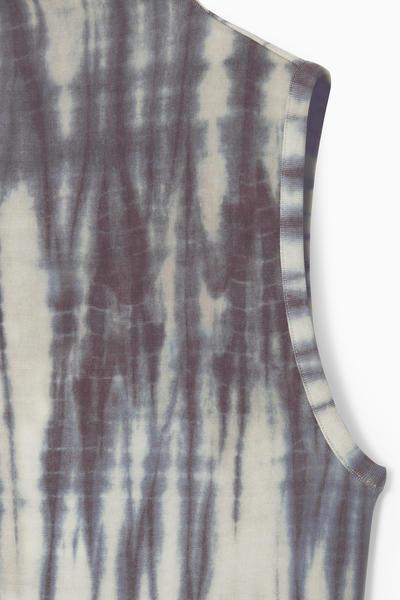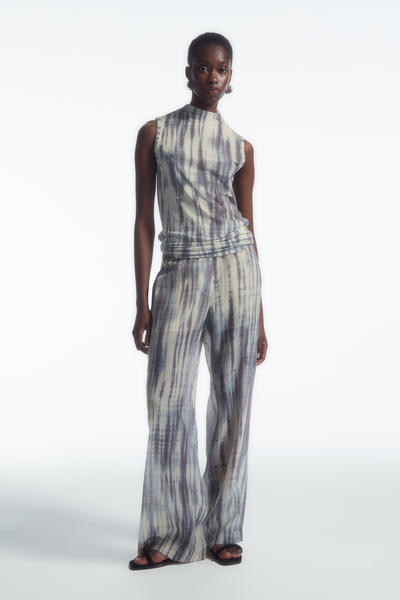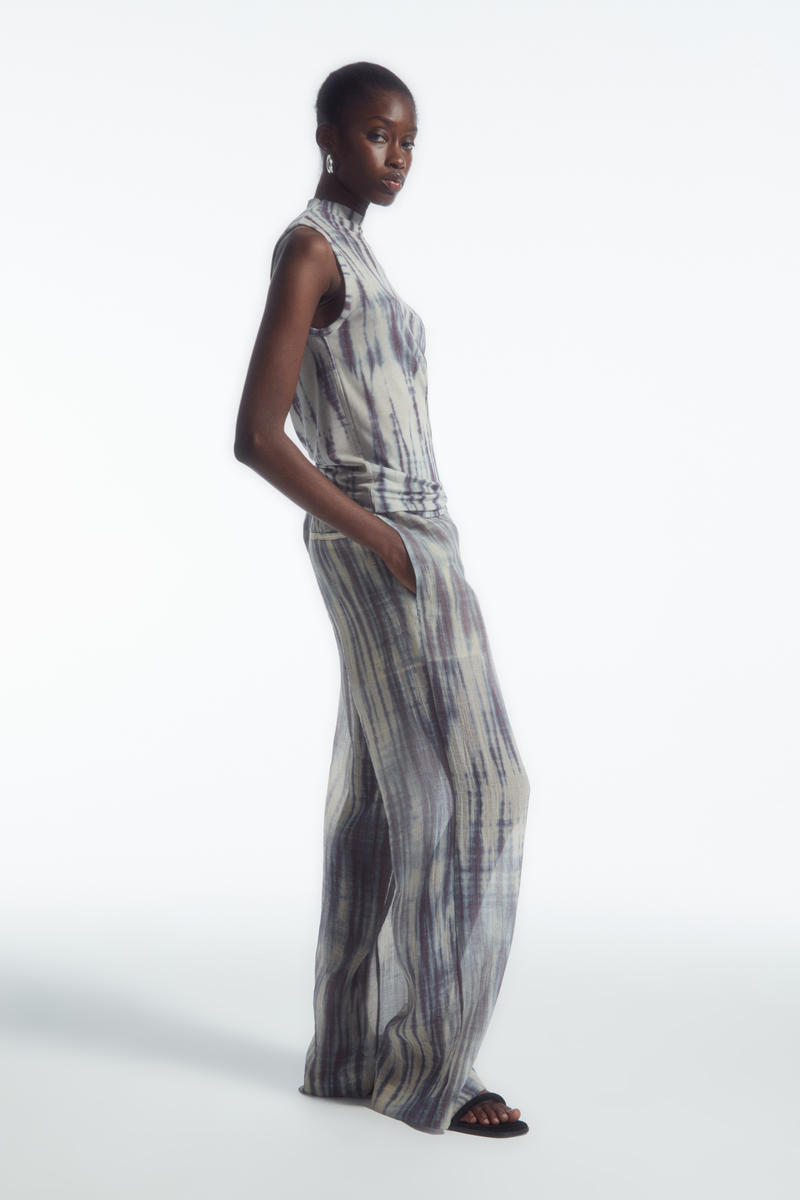 日本の伝統工芸に貢献する、絞り染め職人の田端和樹との限定コラボレーション、COS × たばた絞りが登場。こちらのタンクトップは、生地を折りたたんで糸で縛り、染色して特徴的なストライプ模様を創り出す、手筋絞りの技法を取り入れています。スリムな形にカットされ、ハイネックに仕上げています。お揃いのブレザーとパンツを合わせて、印象的なセットアップスタイルを完成させましょう。
