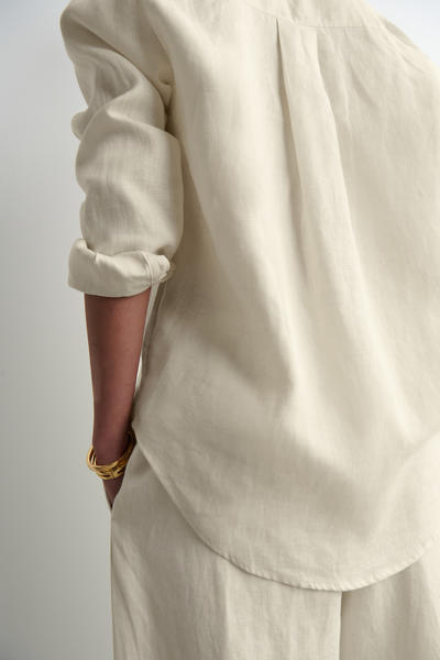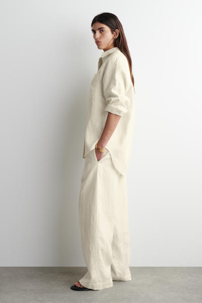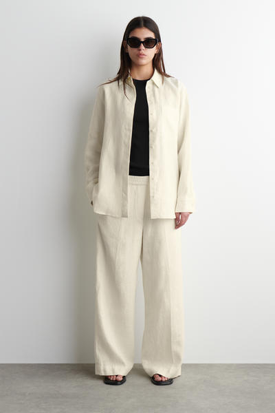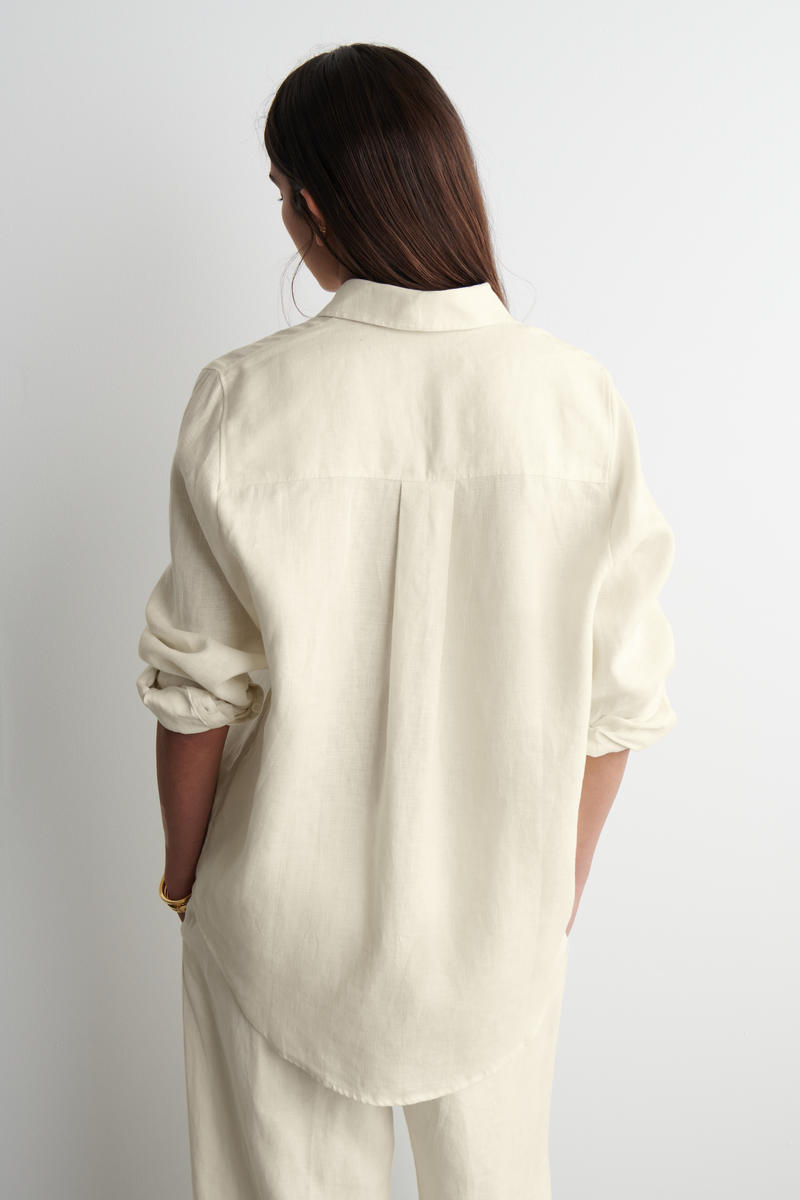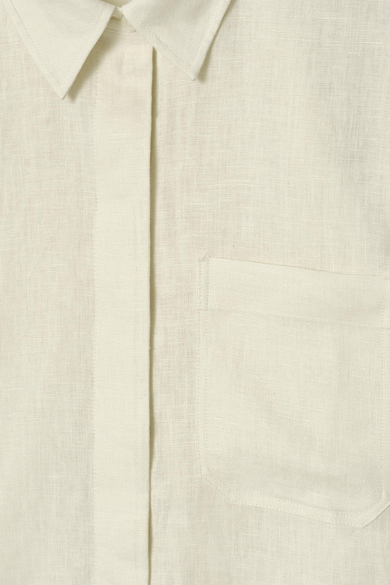 ゆったりとしたフィット感、 軽量で自然な風合いのピュア・リネン製素材が通気性に優れ、暖かな季節に活躍します。 ポインテッドカラー、パッチポケット、カーブした段差のある裾がデザインされています。 (オーバーサイズフィット) 素材:リネン70%、リサイクルリネン30% トリムを除く リサイクルリネンは、糸を紡ぐ廃棄物や生地を裁断する工程で発生する廃棄物から作られています。 (洗濯機洗い可) サイズ:EU36サイズの着丈は78cm/モデルはEU36サイズを着用