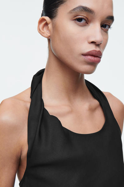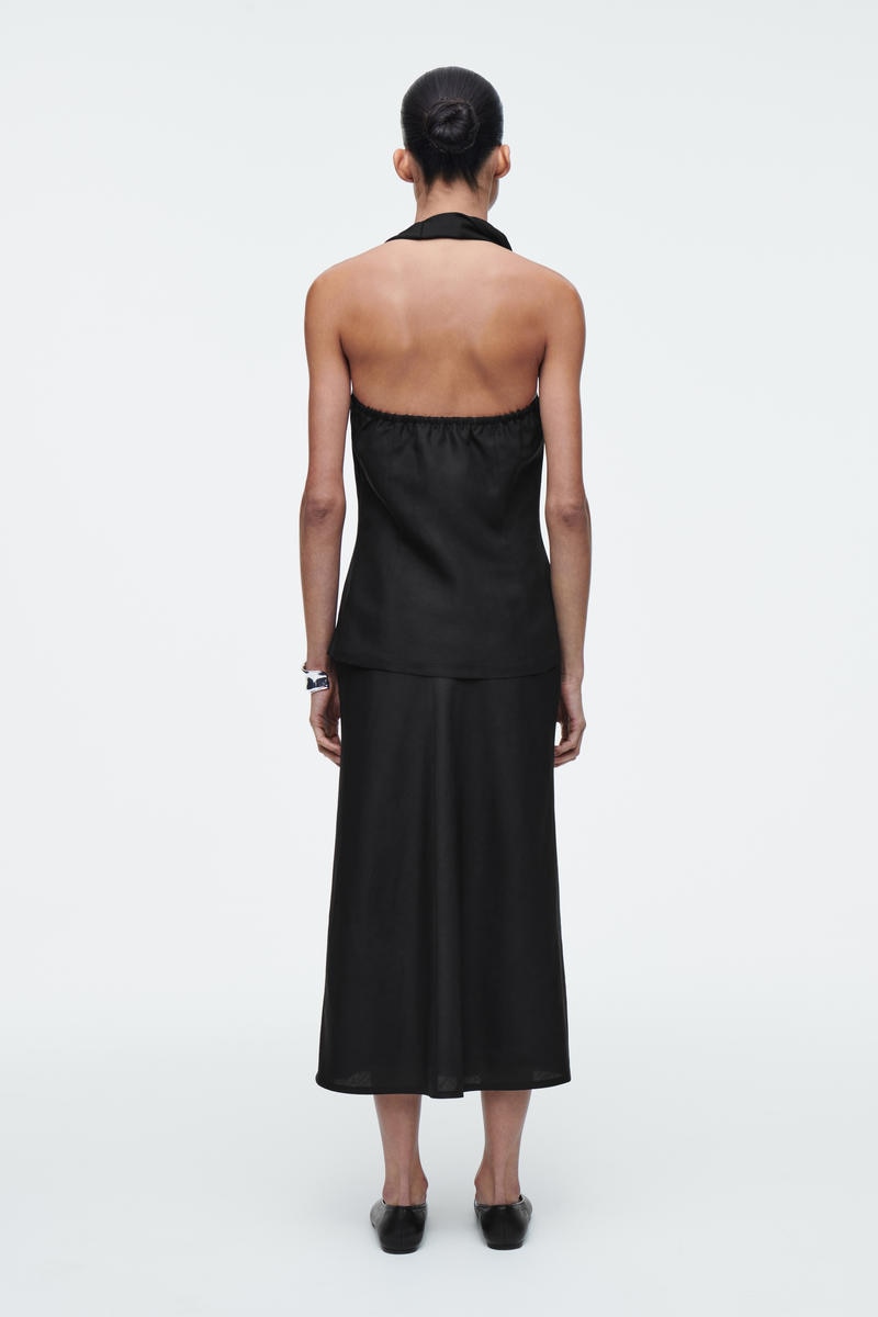 暖かい季節にぴったりなバイアスカットのトップス。TENCEL®リヨセルとリネンの軽量ブレンド素材で、ねじりデザインのホルターネックと伸縮性のある背中が特徴です。お揃いのスカートと合わせてセットアップスタイルに。
