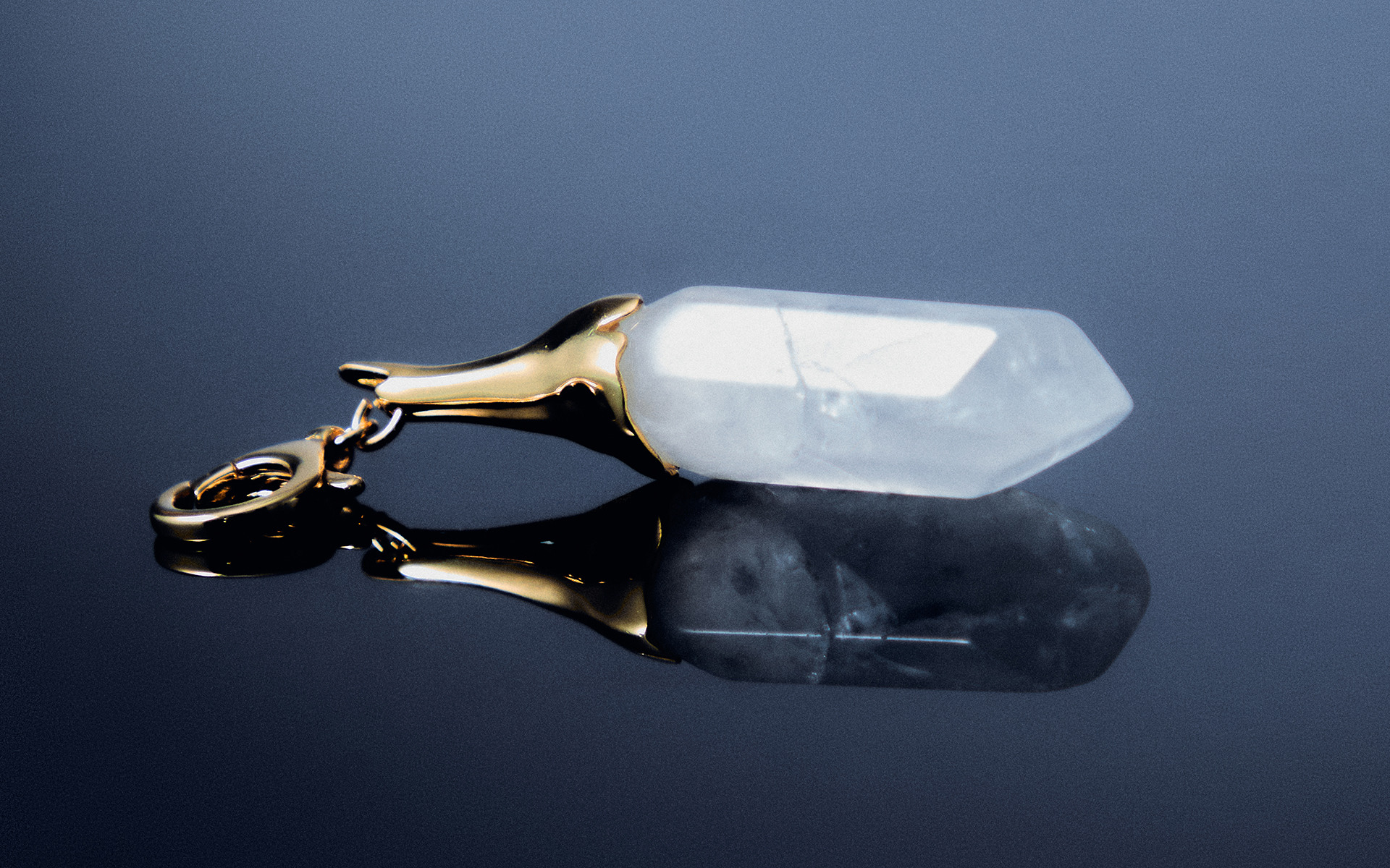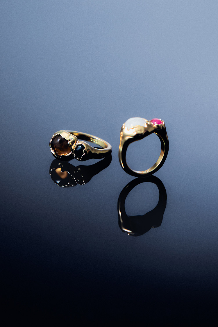 정교하게 커팅한 주얼리 컬렉션은 각각의 의미를 담고 있습니다. 투명한 석영은 투명함과 치유를, 스모키 석영은 보호를, 블루 타이거 아이(blue tiger eye)는