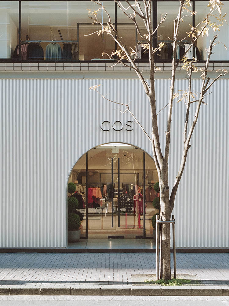 도쿄의 번화한 긴자 지역에 자리한 COS 매장은 고전주의 건축 양식에서 영감을 받아 디자인 한 아치 구조물과 곡선형 창문으로 이루어진 아름다운 외관을 자랑합니다.