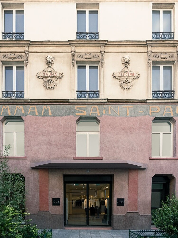 파리 4구 중심인 마레 지구의 자갈길과 푸른 안마당 가까이에 자리한 이 건물은 1856년에 완공되었습니다. 이로부터 7년 뒤 이곳은 130년 동안 터키식 전통 목욕탕으로 사용되었으며, 2009년에 마침내 COS가 자리를 잡았습니다.