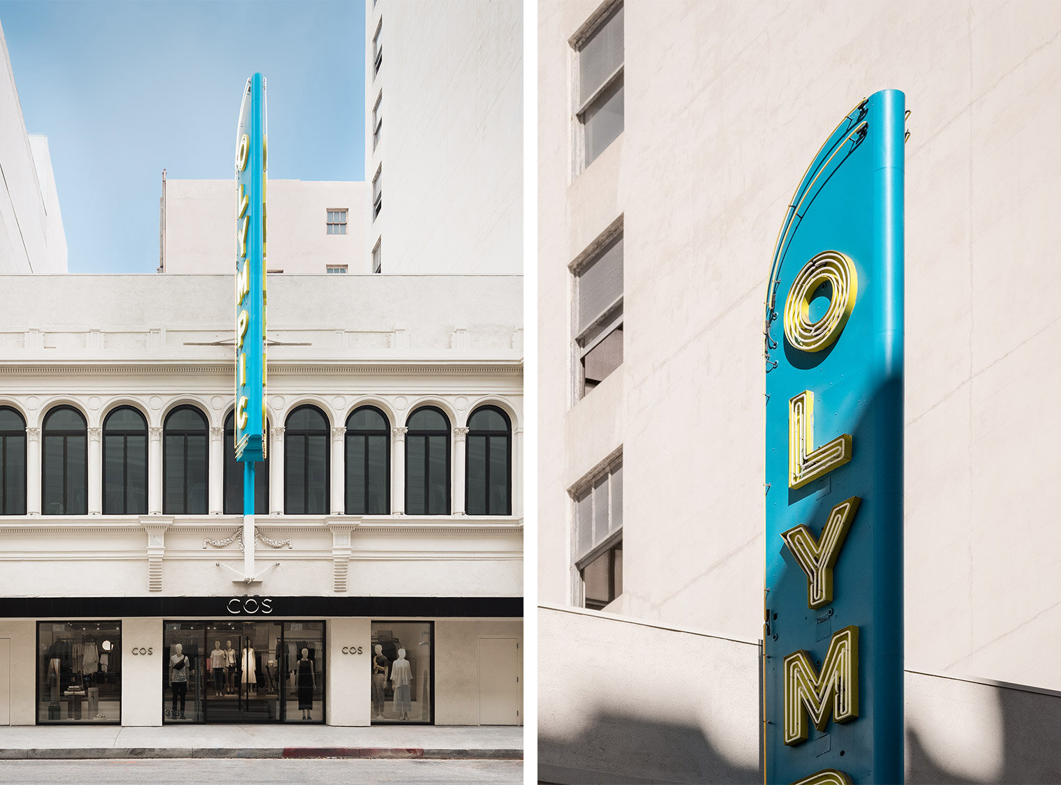 밖에는 기념할만한 가치가 있는 과거의 상징인 네온사인의 불이 다시 켜지고 있으며, 내부에서는 COS 컬렉션 사이로 원래 있었던 무대의 윤곽을 여전히 볼 수 있습니다.