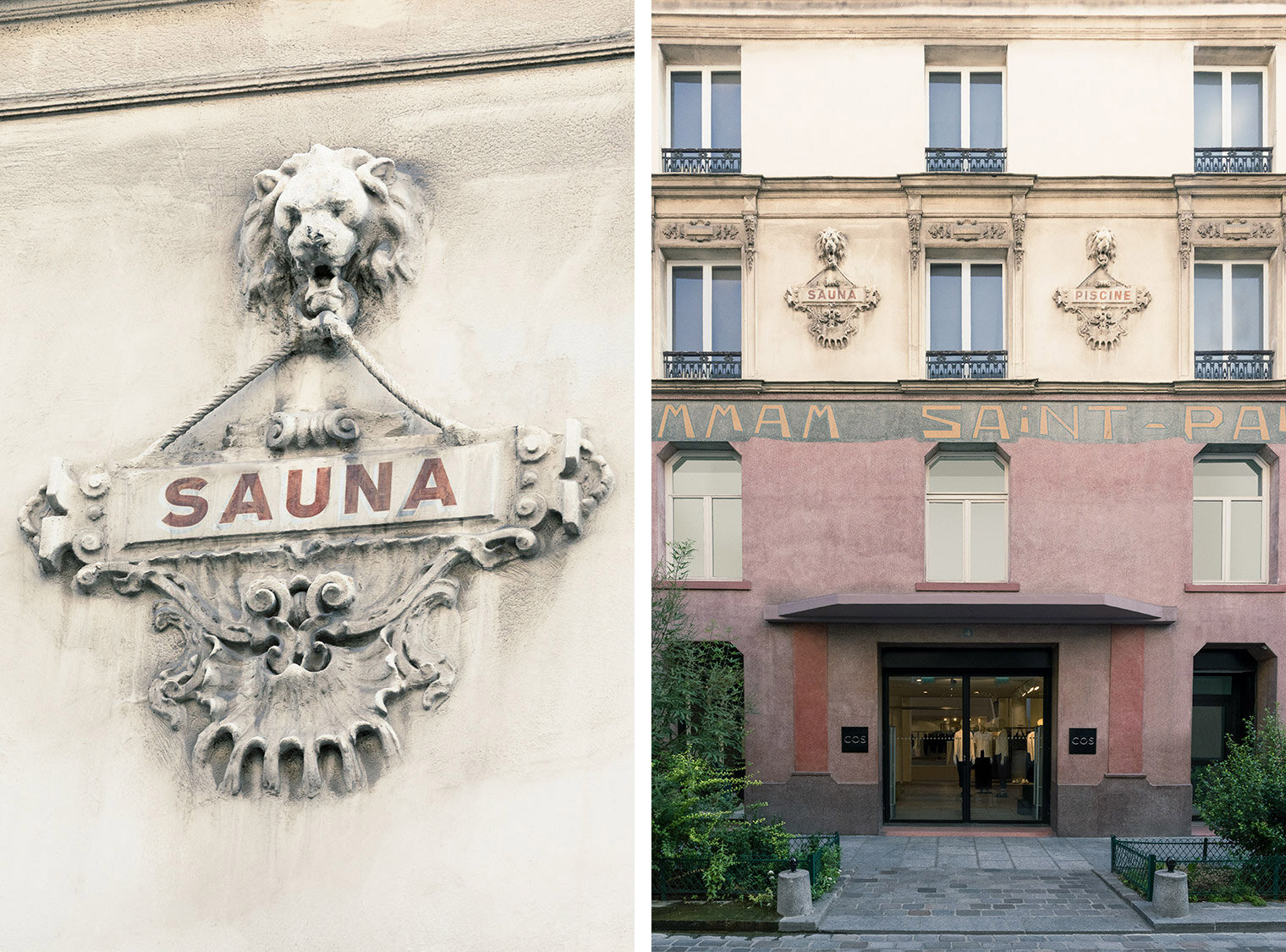 건물 외벽에는 사우나와 수영장에 대한 안내 문구가 새겨진 석조물이 지금까지도 남아 있으며, 그 위에는 당시 유행하던 모티프였던 사자 머리가 조각되어 있습니다. 일 층에는 ‘생폴