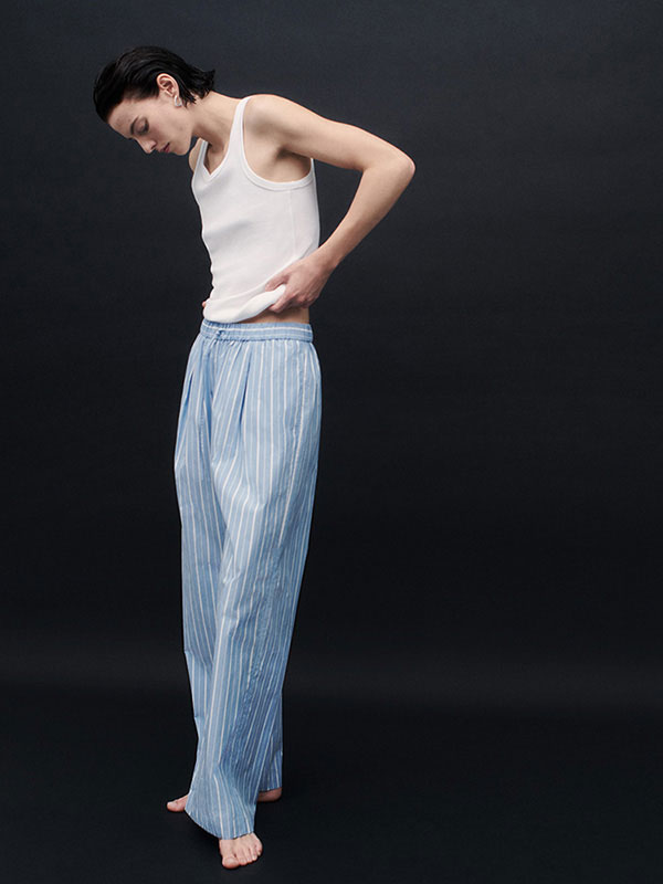 이번 시즌, 핀 스트라이프 트라우저는 클래식한 파자마 룩을 대표하는 아이템입니다.