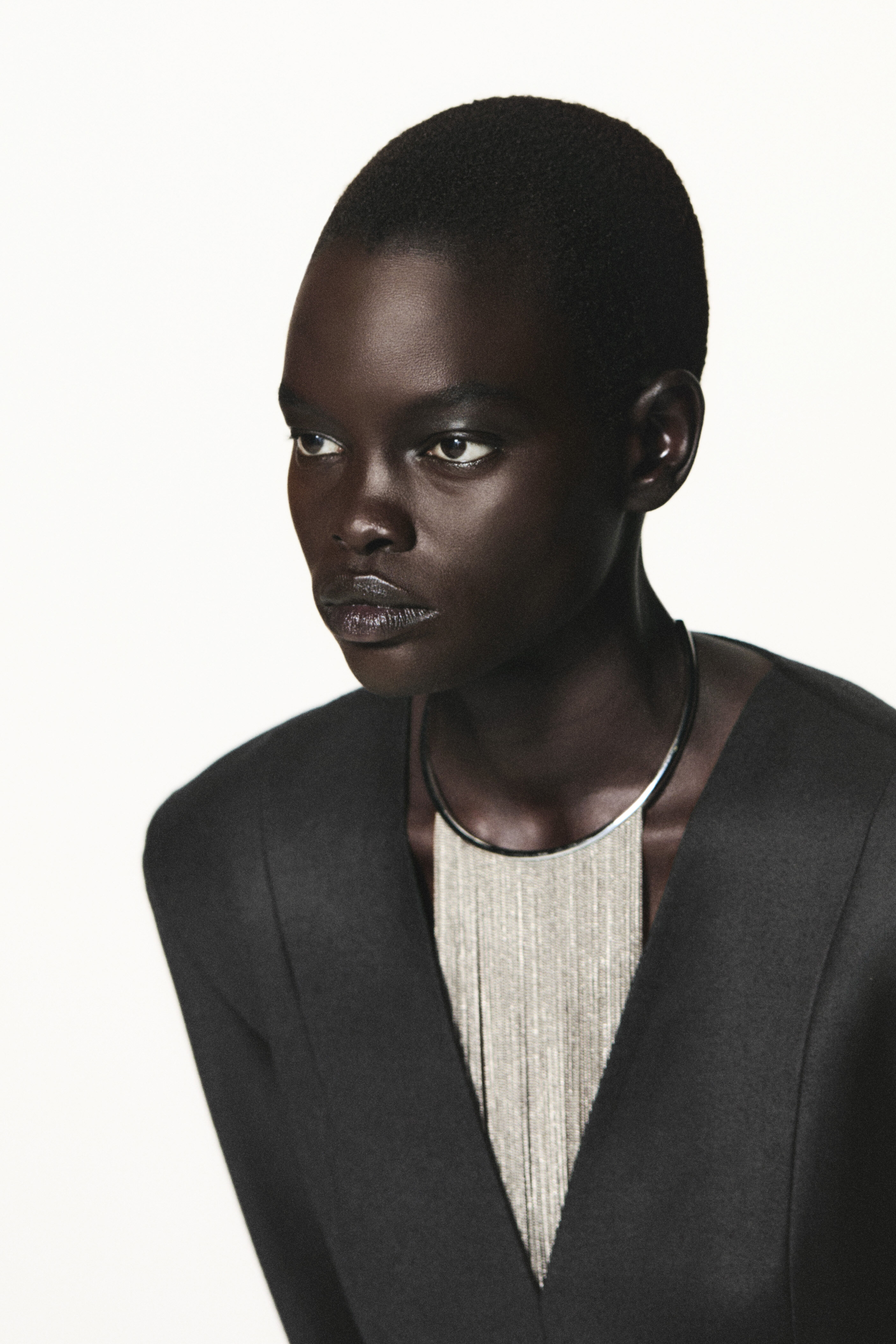 영감을 받은 실루엣으로 재해석되었습니다. 정교한 테일러드 트라우저와 매치해 셋업을 완성하고, 실크 타이 디테일의 탑, 스테이트먼트 스타일의 네크리스, 주요 아이템인