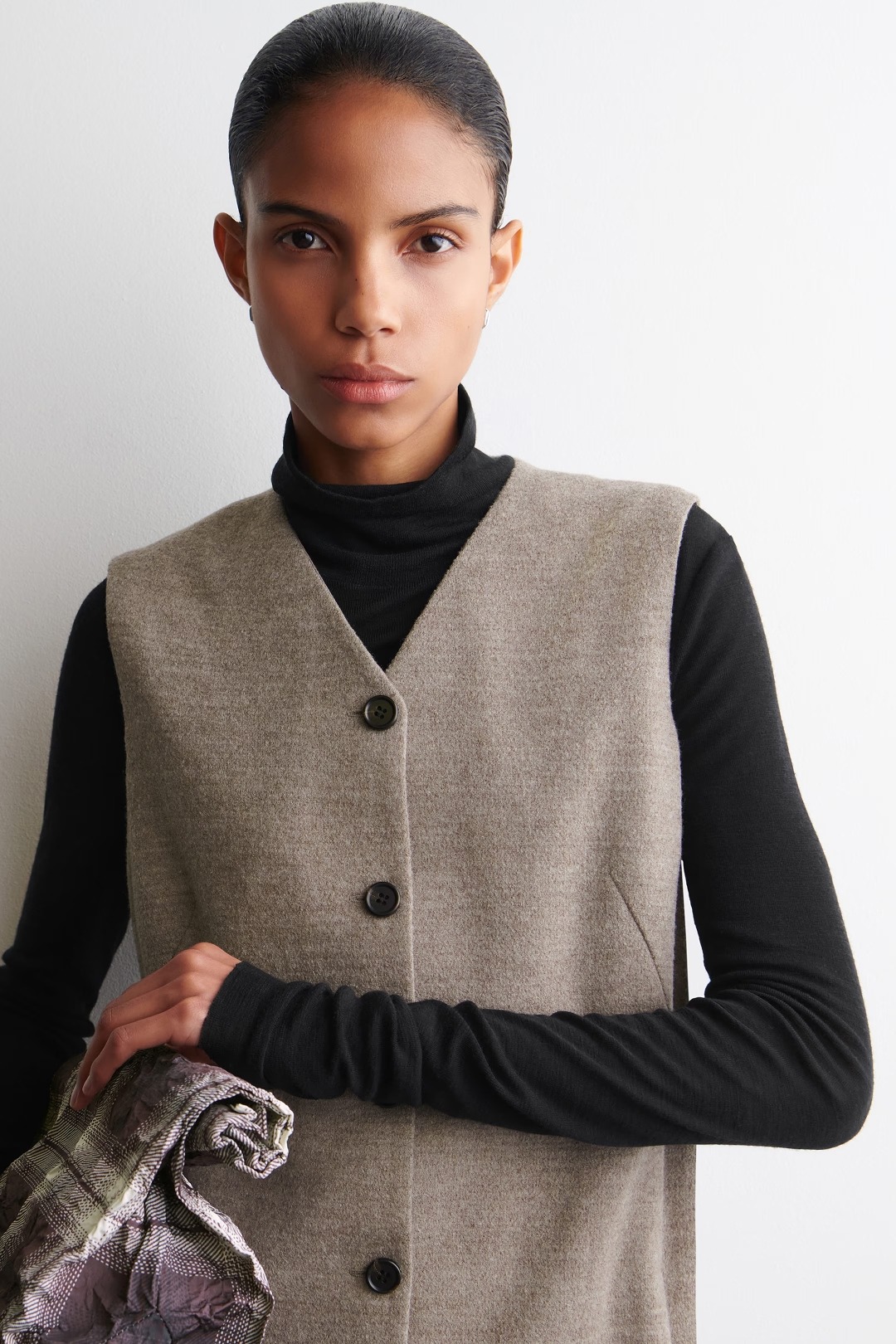 있습니다. 슬리브리스 스타일은 레이어링에 최적화된 아이템으로, 파인 메리노 울 터틀넥과 타이츠, 앵클 부츠를 매치하면 대비되는