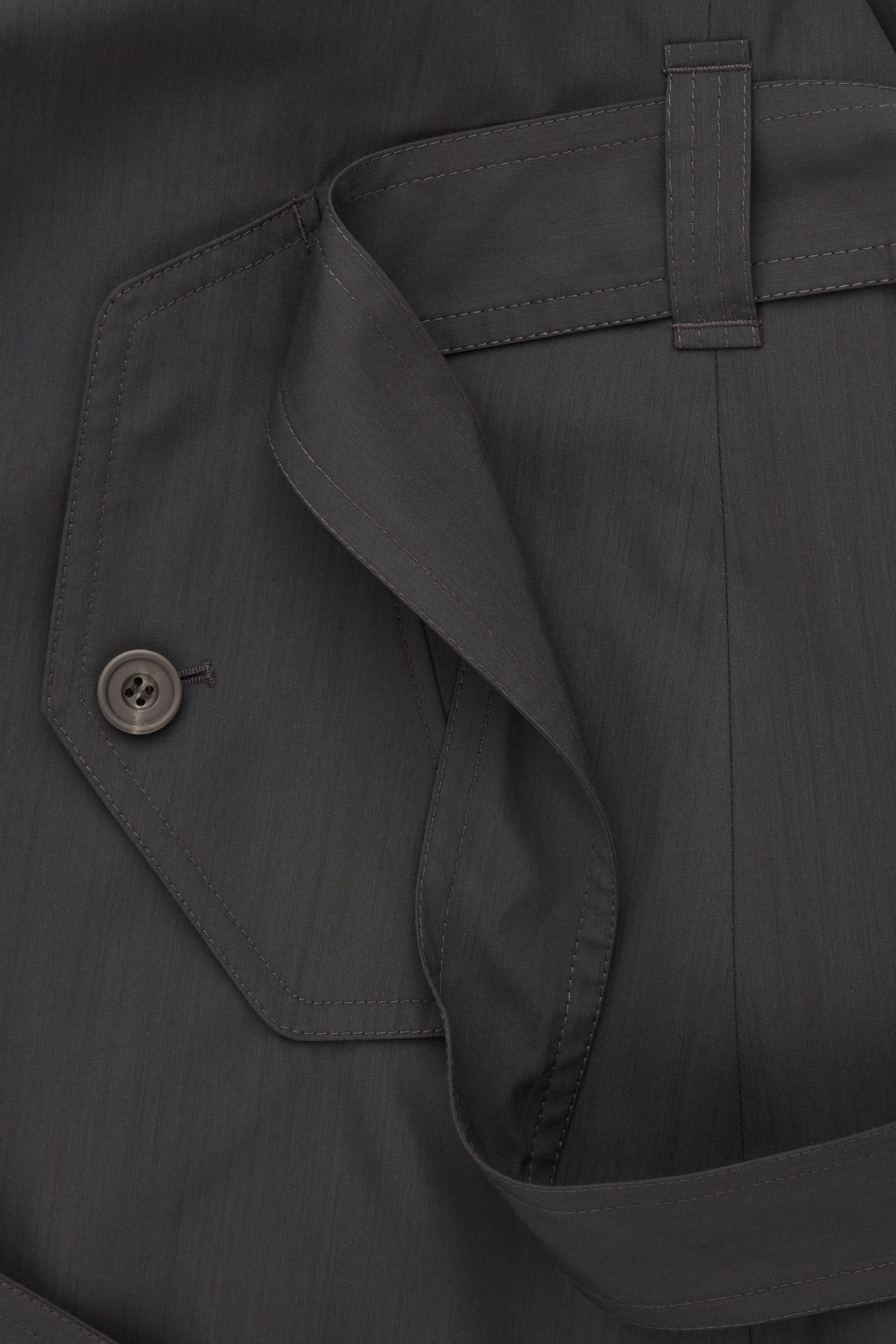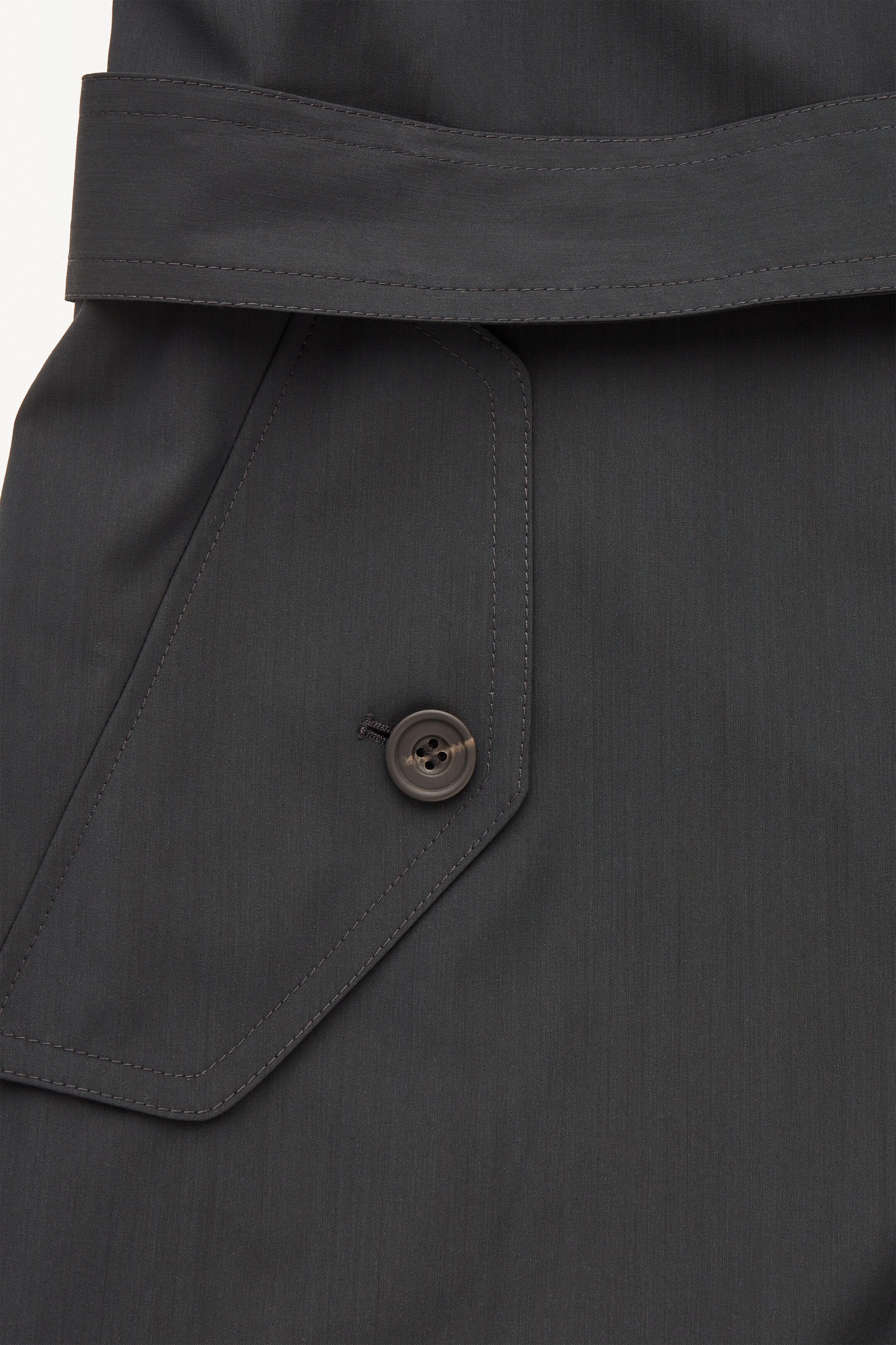 Vi handplockade ett funktionstyg med mjukt fall av återvunnet material och RWS-certifierad ull. Ytan har behandlats för att bli vattenavvisande, så trenchcoaten är med i både ur och skur. Den jordnära, enbärsgröna nyansen passar perfekt till kollektionens mättade färgpalett.