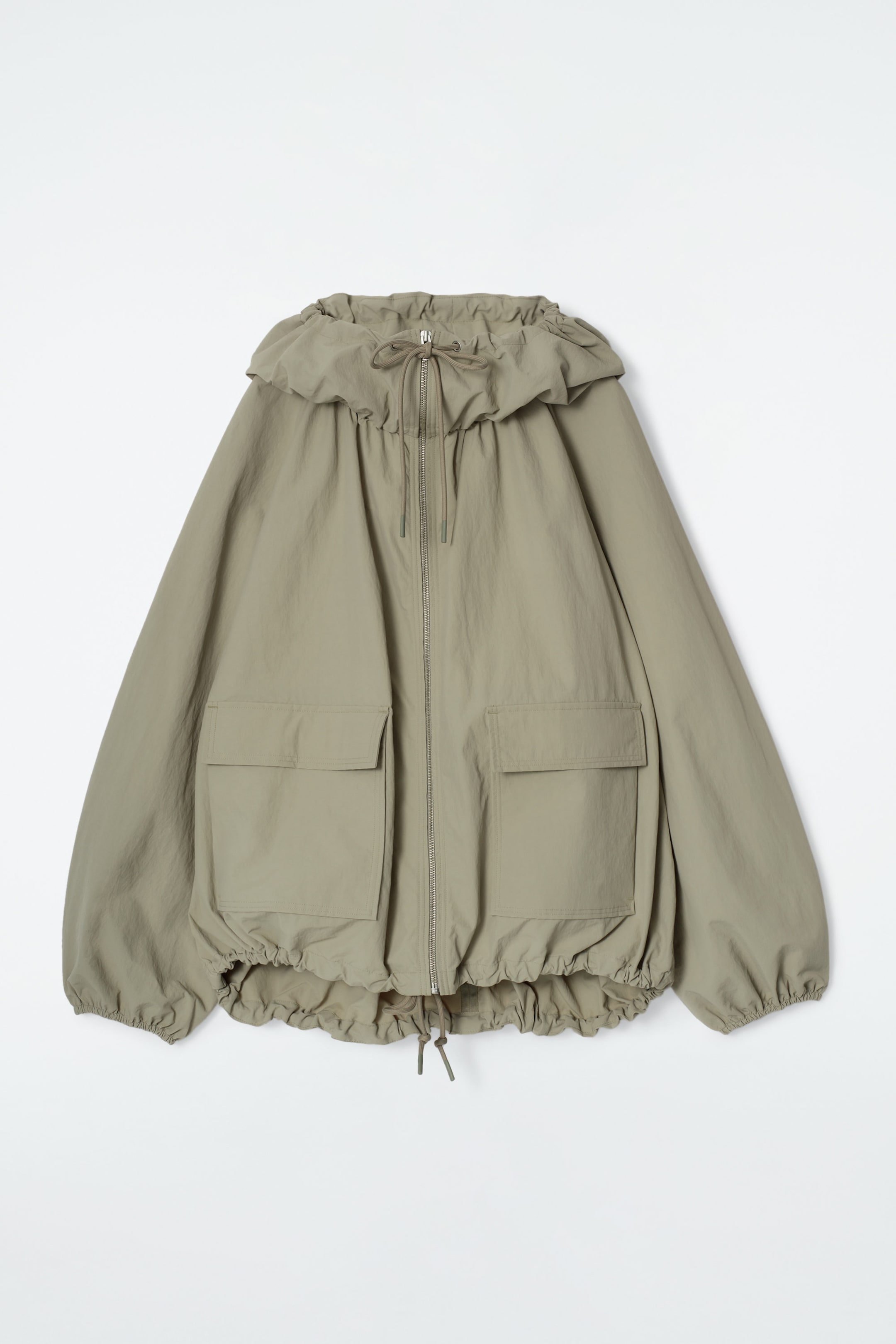 Funktionsinriktade silhuetter tolkas ur ett modernt perspektiv för den kommande säsongen. Det här är en parkas i teknisk, återvunnen nylon med färgmatchad dragsko i krage och nederkant som ger ett kokongformat, bubbellikt snitt. Plagget har fickor med åtkomst från två håll, en omslutande huva och en neutral mullvadsbrun ton.