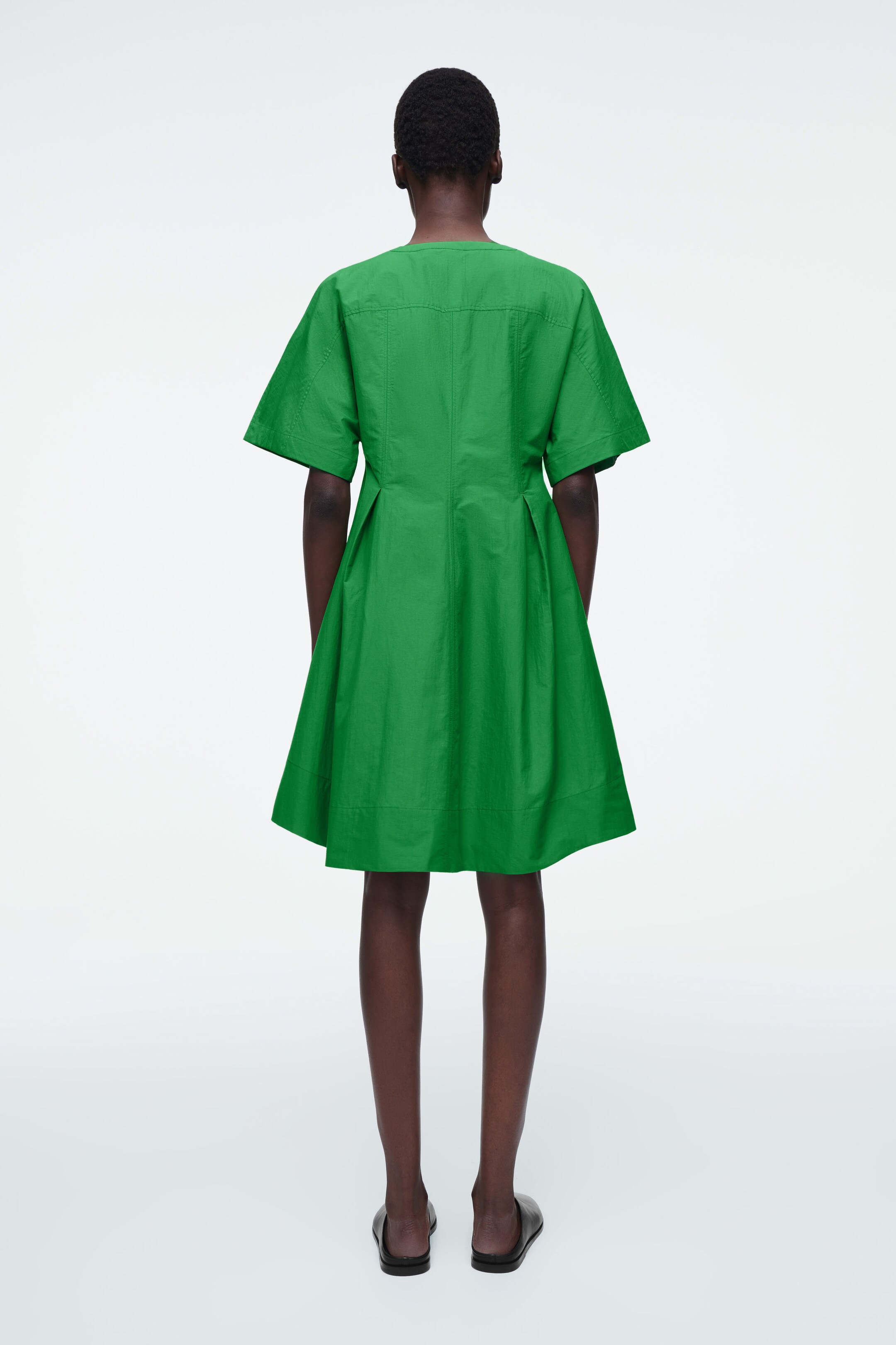 Den här miniklänningen är v-ringad och har ett lekfullt snitt. Designen har djupa veck och en utställd, a-linjeskuren kjol, stängs med tryckknappar samt är tillverkad i en mjuk bomullsblandning.