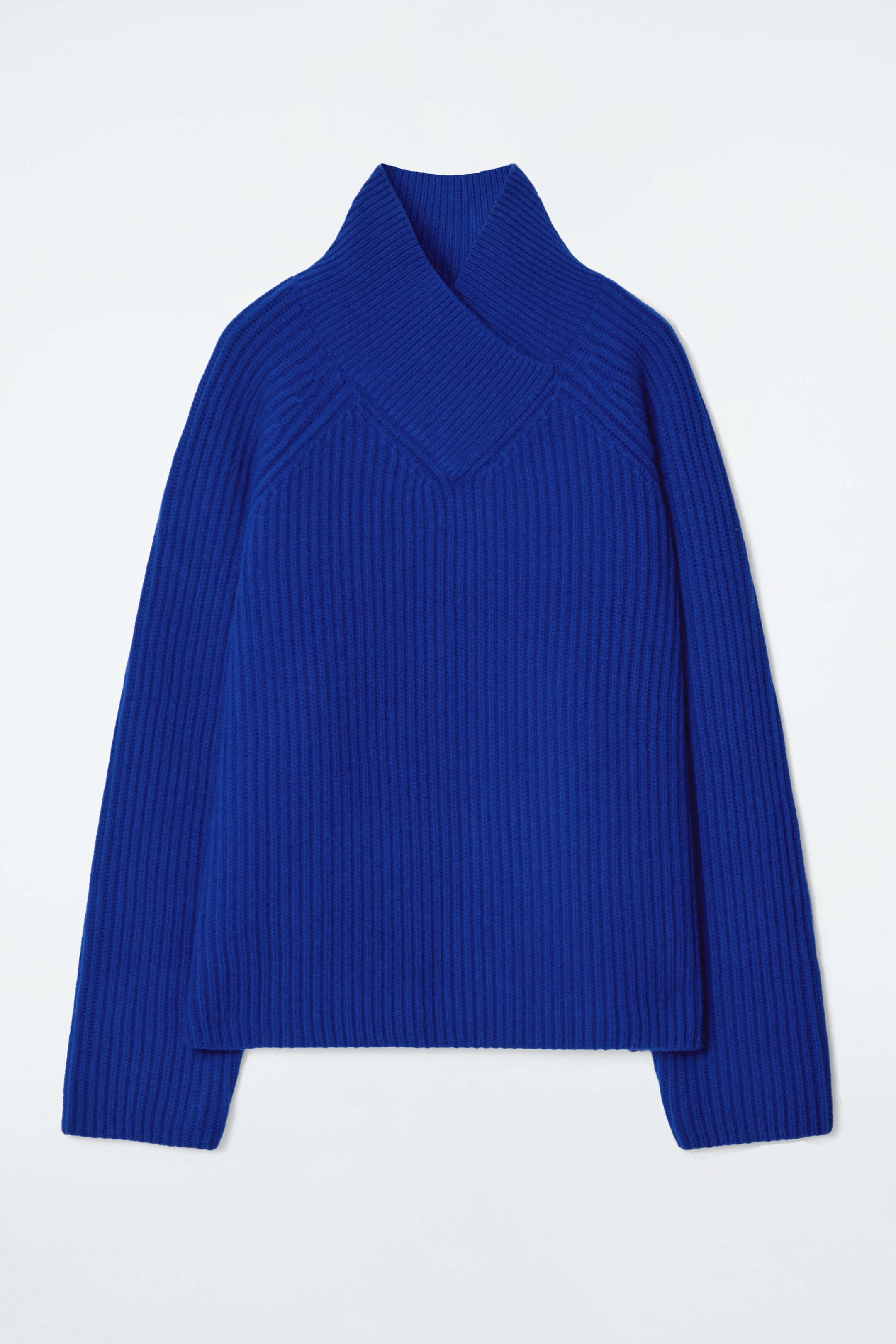 Den här moderna tröjan är ribbstickad av premium merinoull i en livlig, koboltblå ton och har en distinkt krage. Stoppa in håret i kragen för att en enkel men effektiv look.