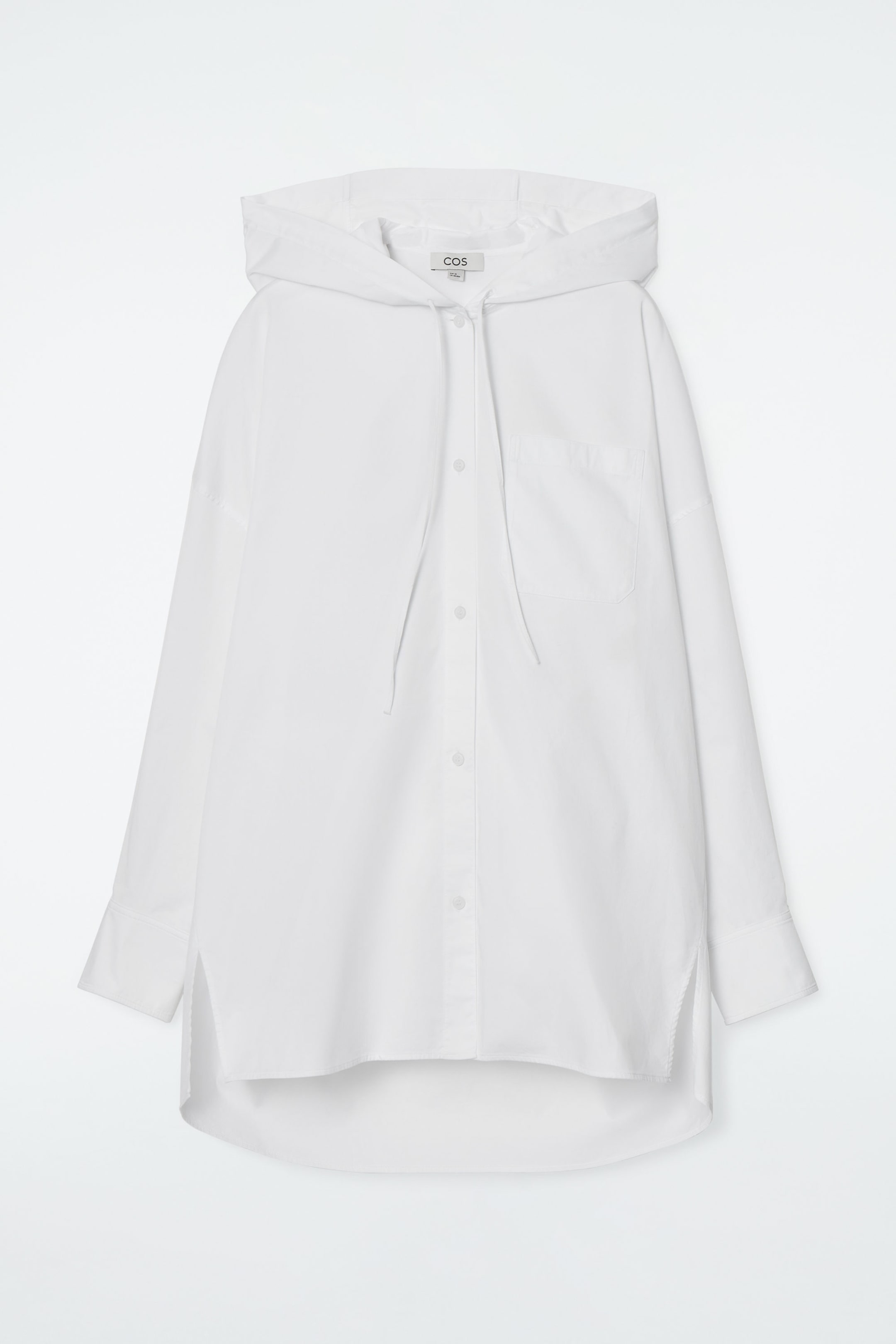 Nytolkningar av pålitliga basplagg präglar COS damkollektion den här säsongen. Den här moderna skjortan är skräddad med oversize-passform av poplin i en mjuk bomullsblandning. Designen har en omslutande huva med dragsko istället för klassisk krage. Den rymliga siluetten är försedd med nedsänkta axelsömmar och voluminösa ärmar som smalnar av vid manschetterna.