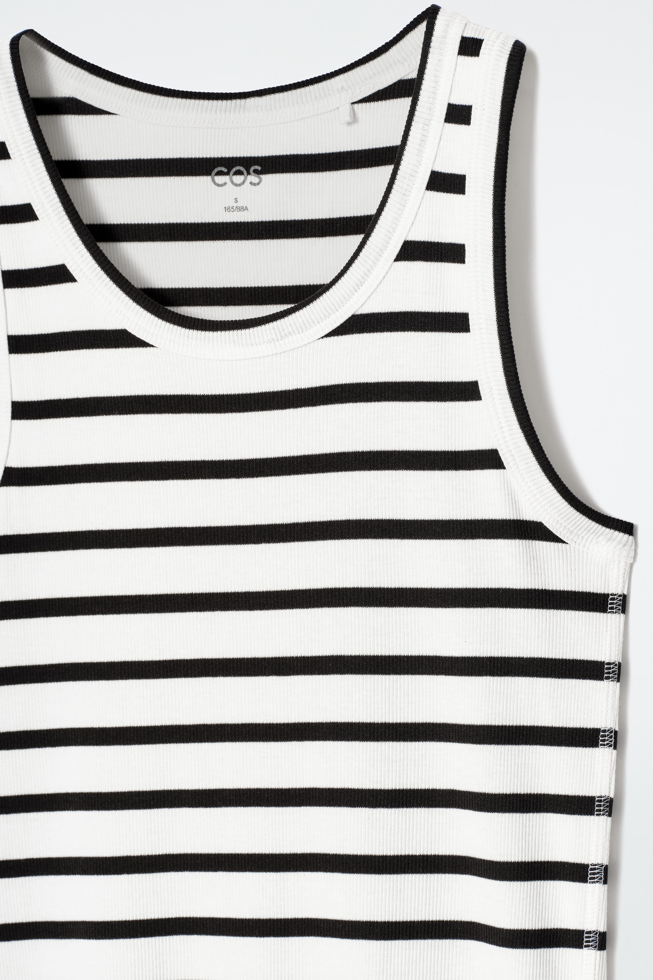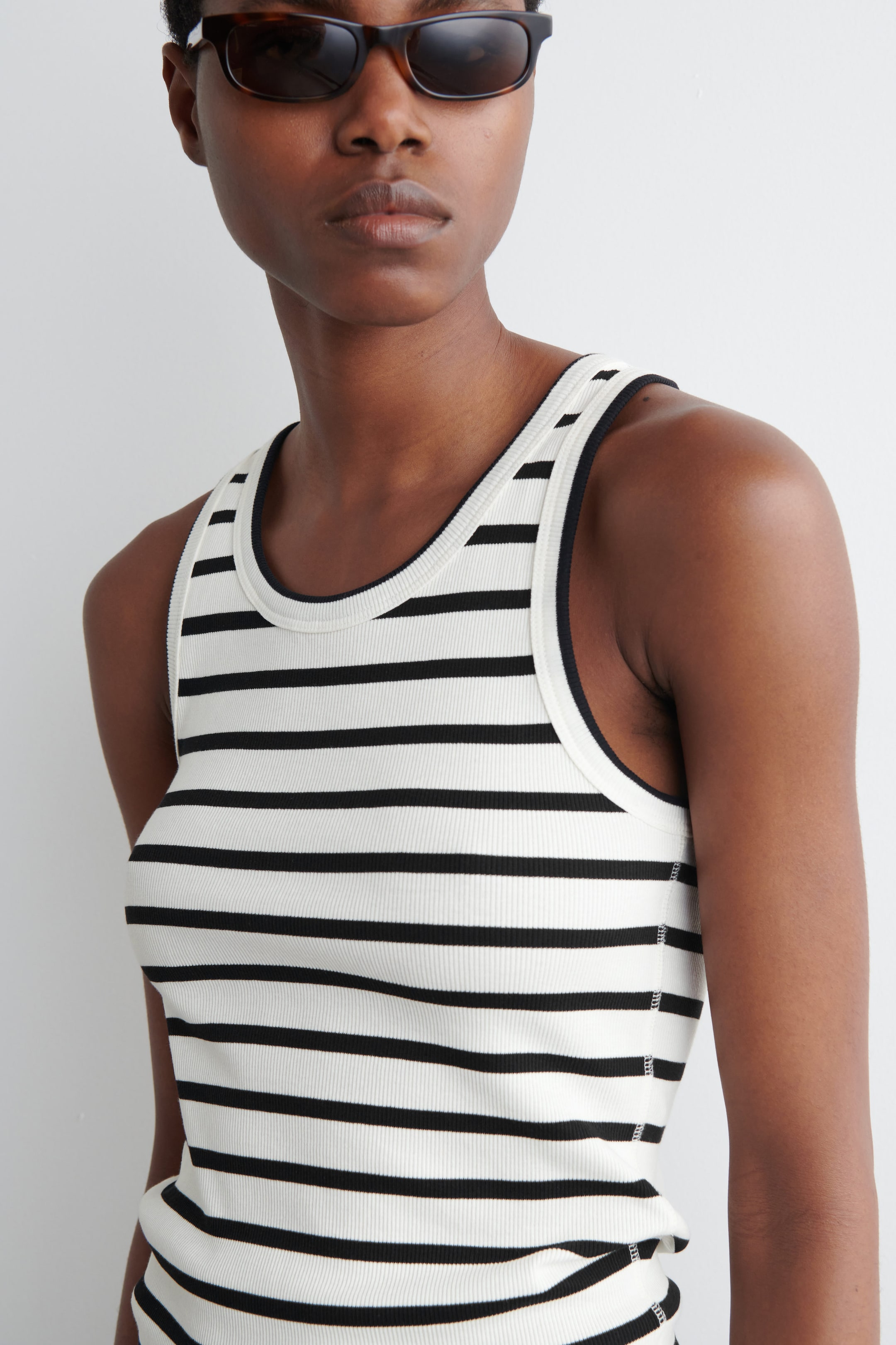 Figursytt linne i ribbstickad, ekologisk bomullstrikå med lätt stretch som passar perfekt under varma sommardagar. De vita och svarta ränderna gör att plagget kan stylas på en mängd olika sätt – bär det på egen hand eller som ett lager under en skjorta eller kavaj.