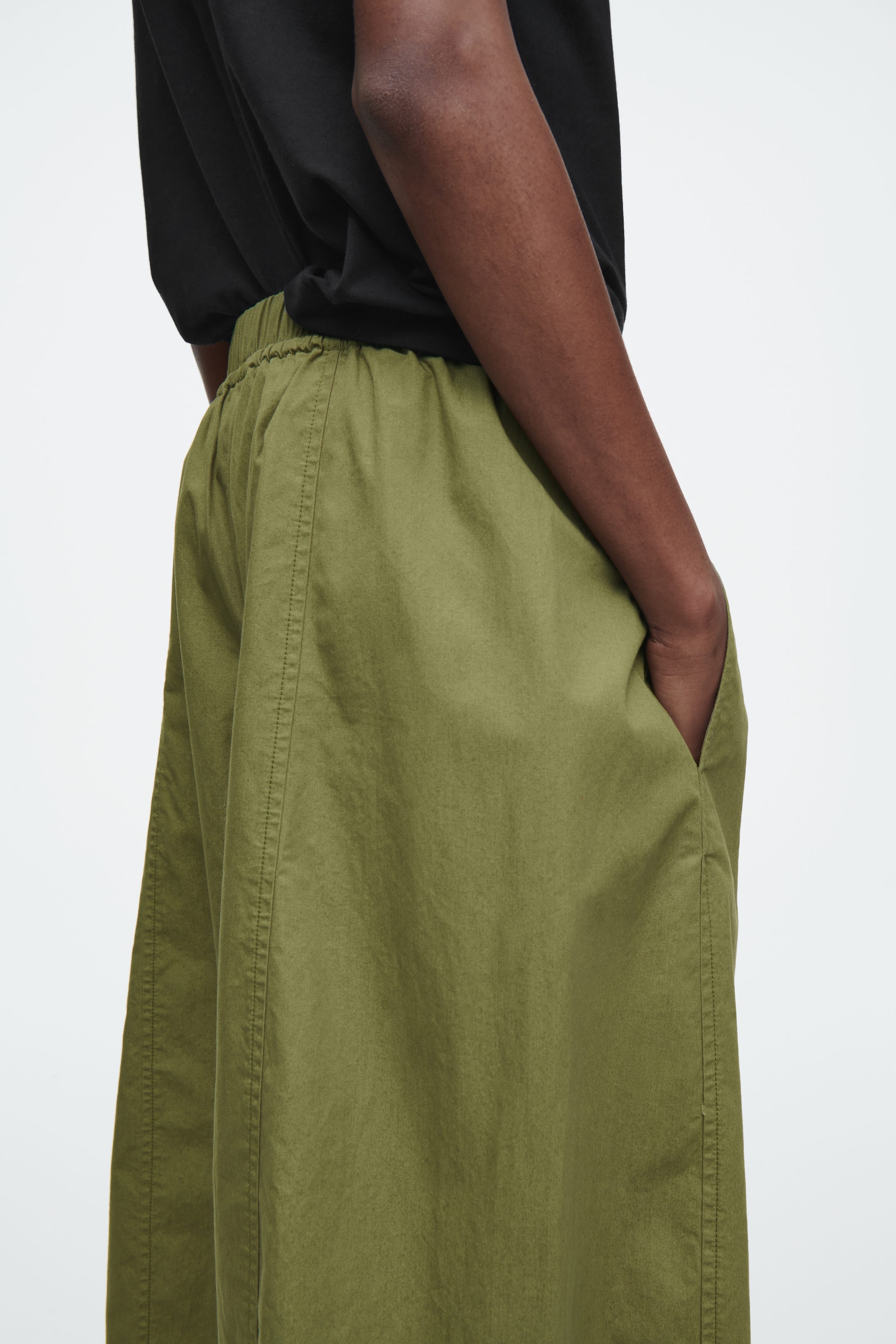 Dessa lediga byxor i en khakigrön nyans är tillverkade av lätt bomull med asymmetriskt placerade sömmar som ger den voluminösa siluetten med barrel-legs subtil definition. Till designdetaljerna hör en bred linning med stretch, färgmatchade dragskor och snedställda sidofickor.