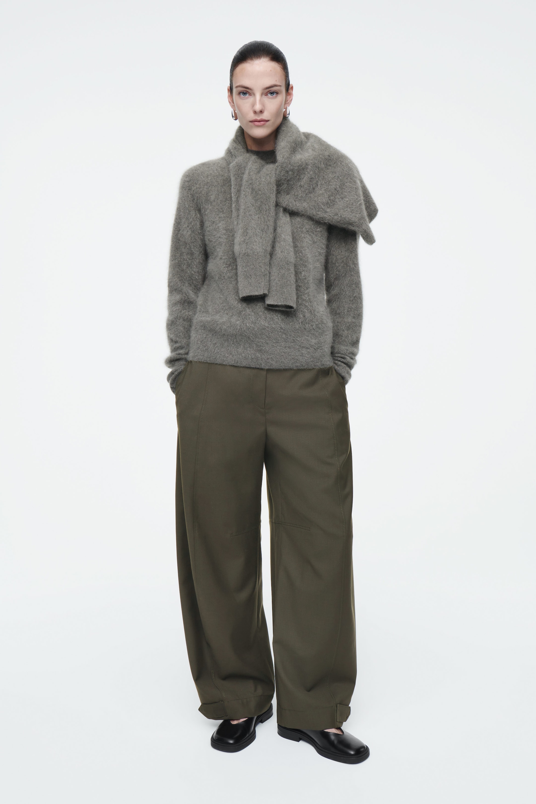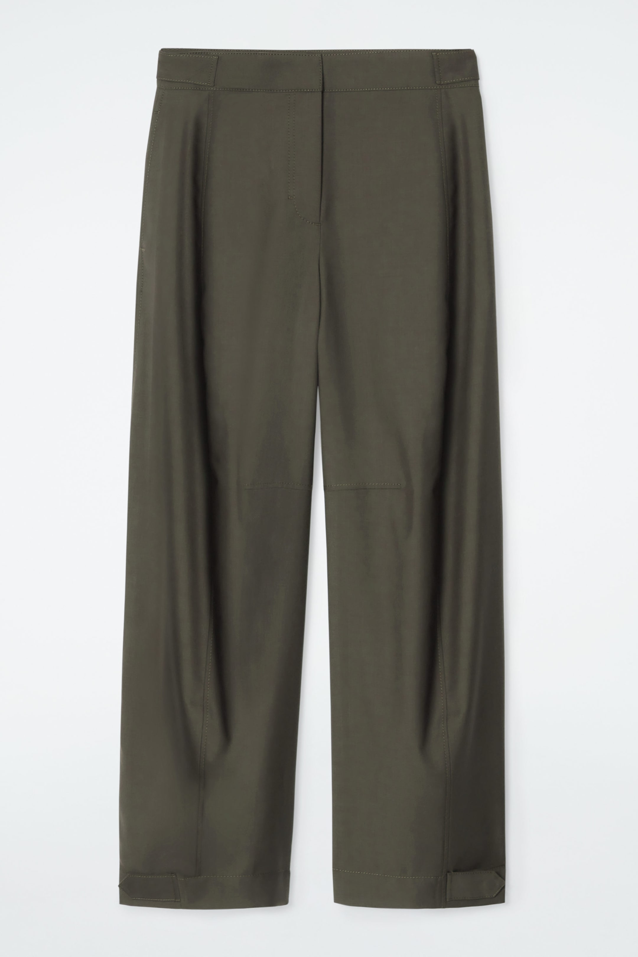 Den här säsongen tolkar COS designteam utility för dam på ett lågmält sätt. Dessa moderna byxor är tillverkade av RWS-ull i ett ledigt snitt med cylinderben som har överdrivna proportioner. Den voluminösa siluetten kan justeras med hjälp av tryckknappar i midja och benslut.
