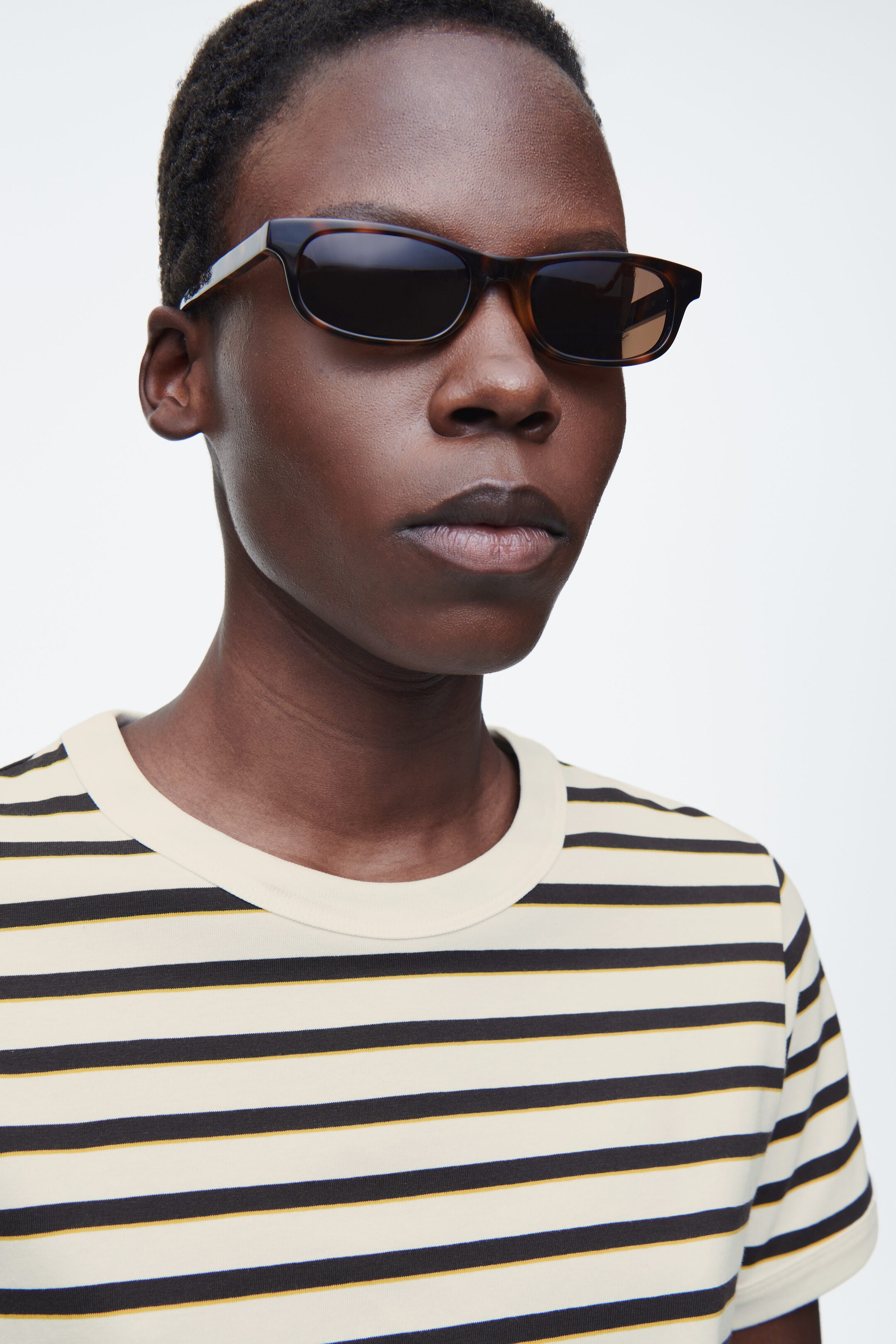 Denna randiga T-shirt fångar 80-talsnostalgin genom sin åtsittande passform. Den är tillverkad av otroligt mjuk bomull och har rund hals och korta ärmar med kontrastsömmar. Våra stylister tipsar om att kombinera den med denim.